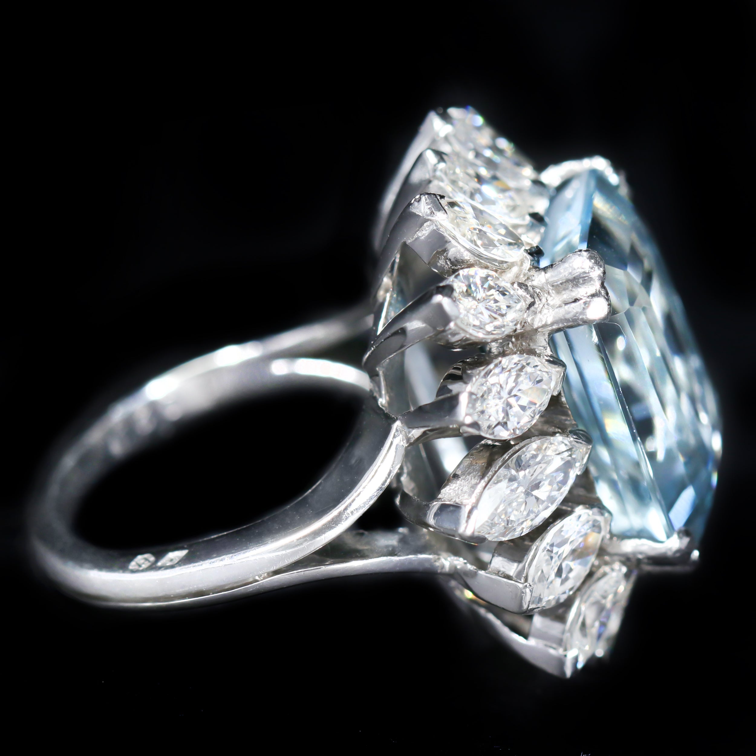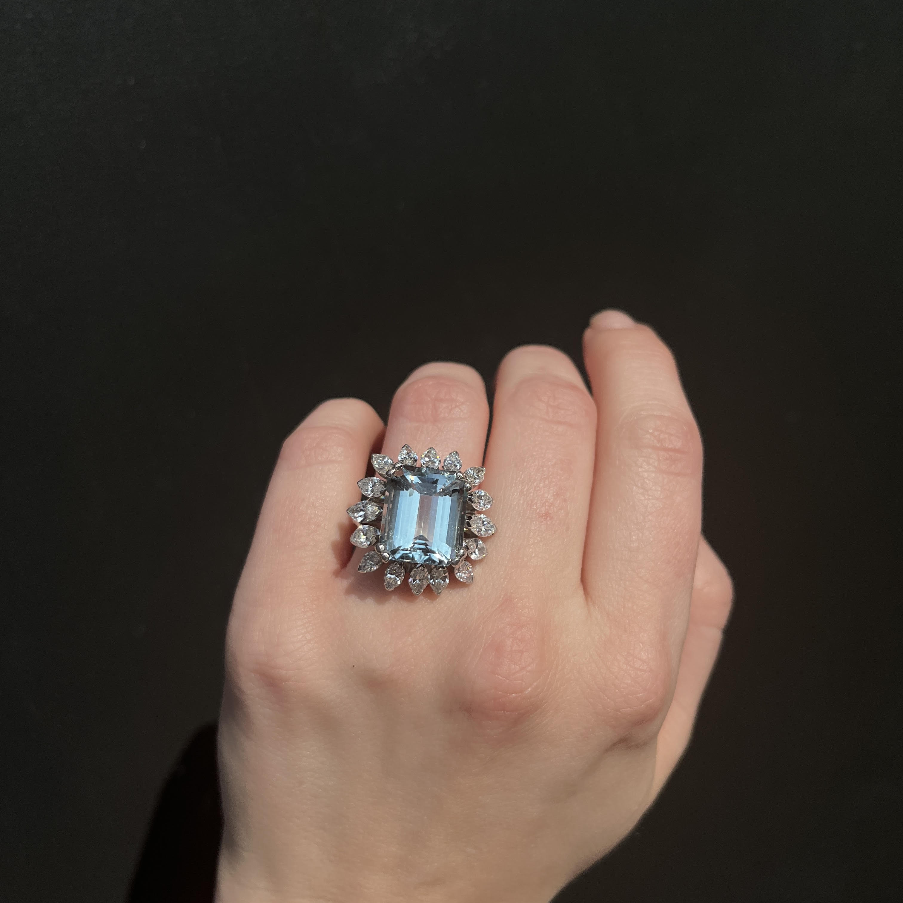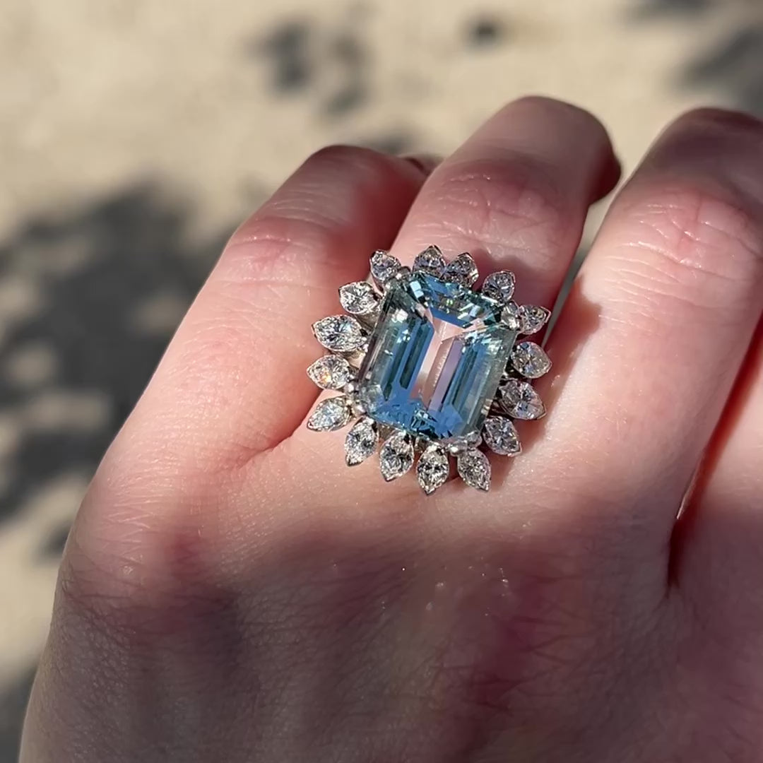 Mid century platinum, aquamarine, and diamond ring. This exquisite platinum ring features a stunning emerald-cut aquamarine, prong-set at the center to showcase its captivating blue hues. Surrounding the aquamarine is a radiant frame of sixteen marquise cut diamonds, arranged in a spray that mimics the delicate petals of a flower. The combination of the shimmering aquamarine and the striking marquise diamonds creates a beautiful contrast, evoking both elegance and boldness in a design that is timeless yet distinctively vintage.