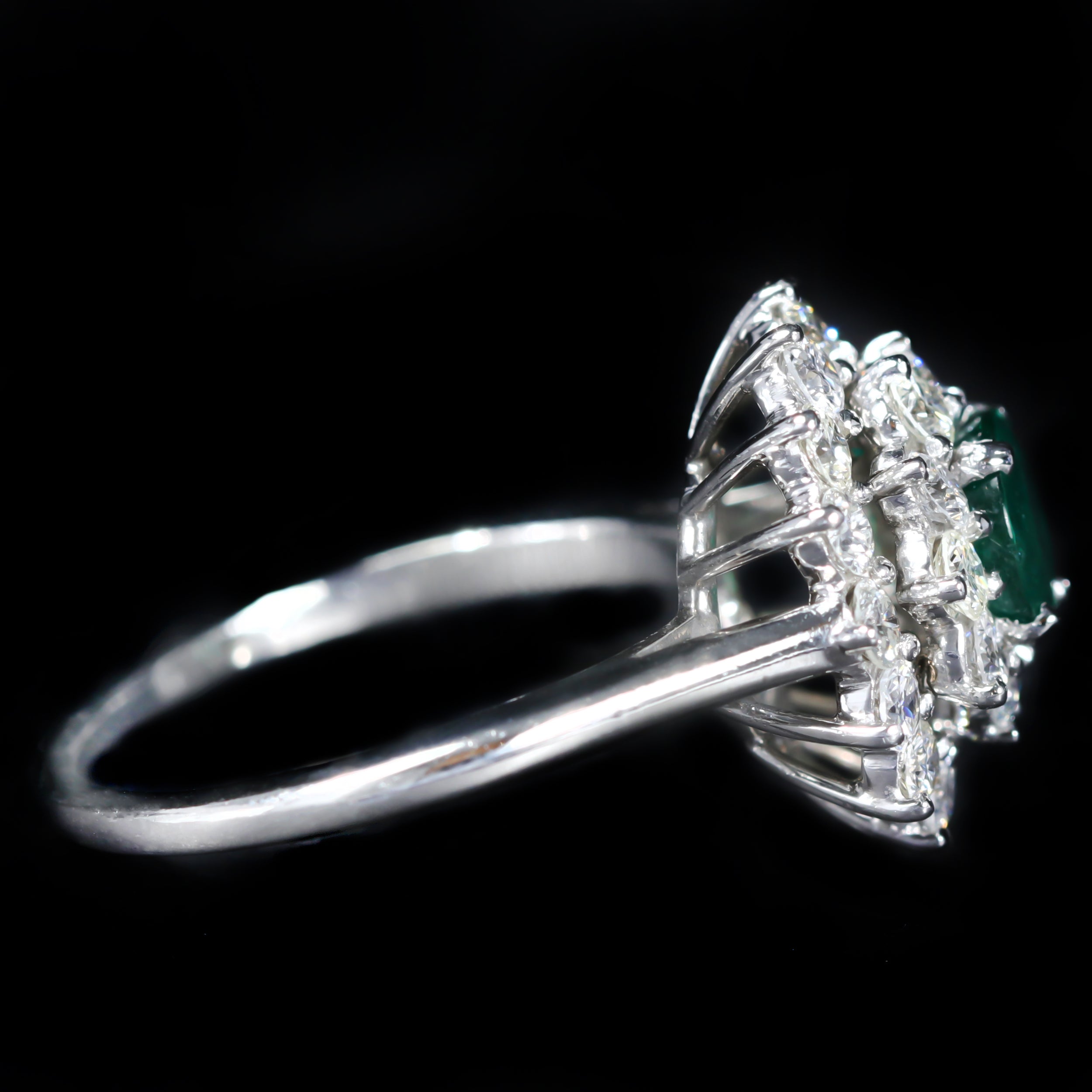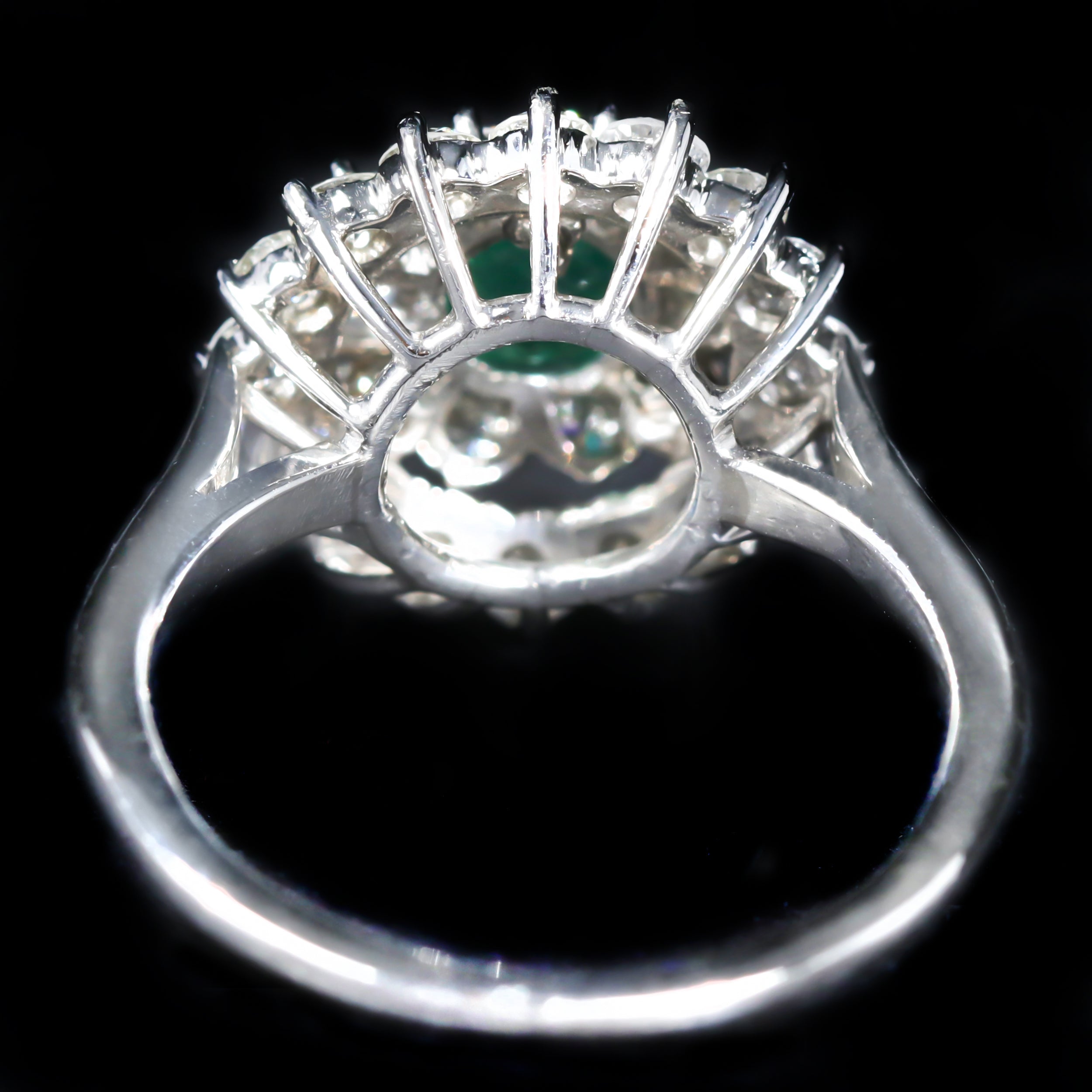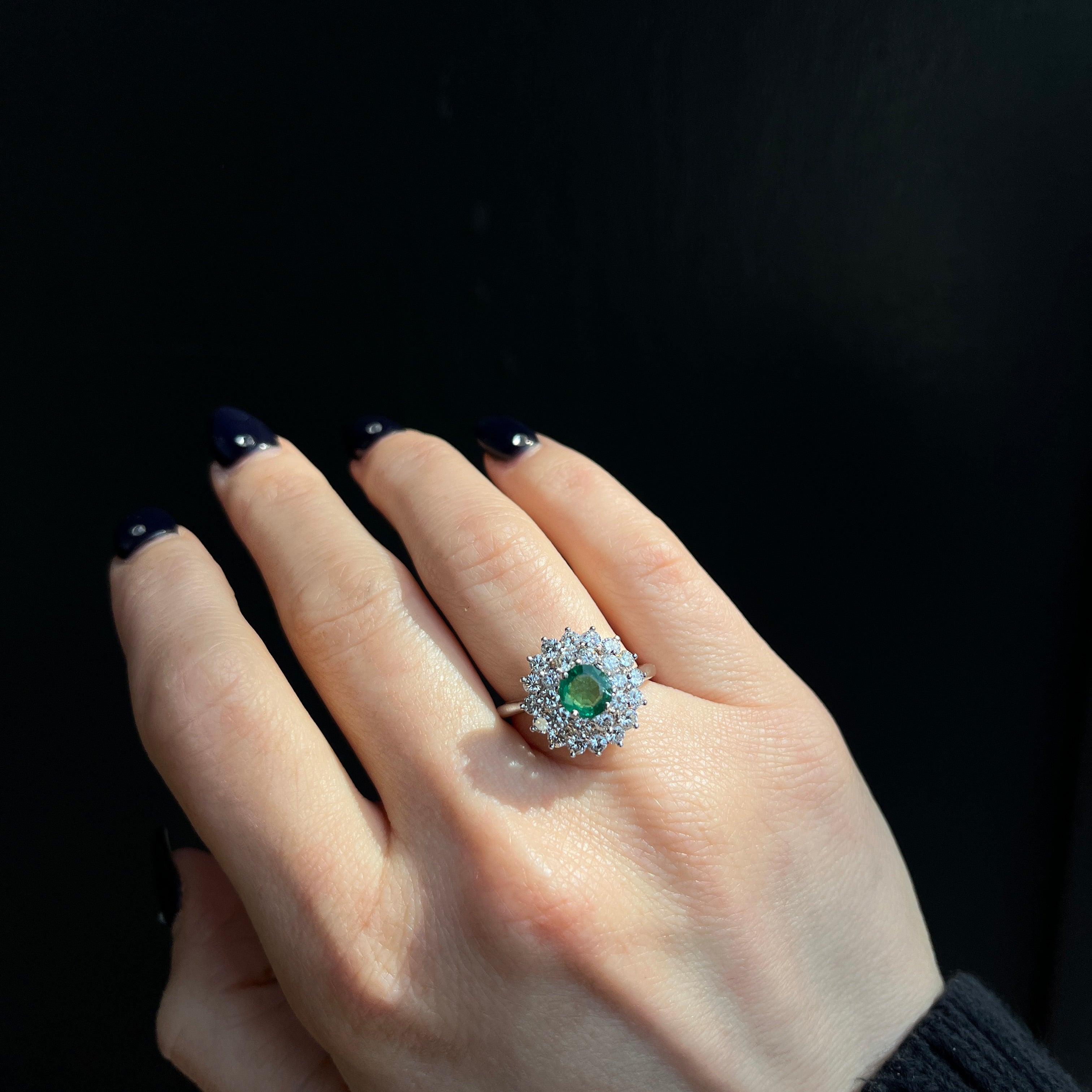 Estate platinum, emerald, and diamond ring. A glowing green emerald crowns this beautiful ring, its mesmerizing hues glistening within a cluster of dazzling round brilliant cut diamonds. The luxurious platinum mounting ensures timeless shine, resulting in a truly captivating dinner ring.