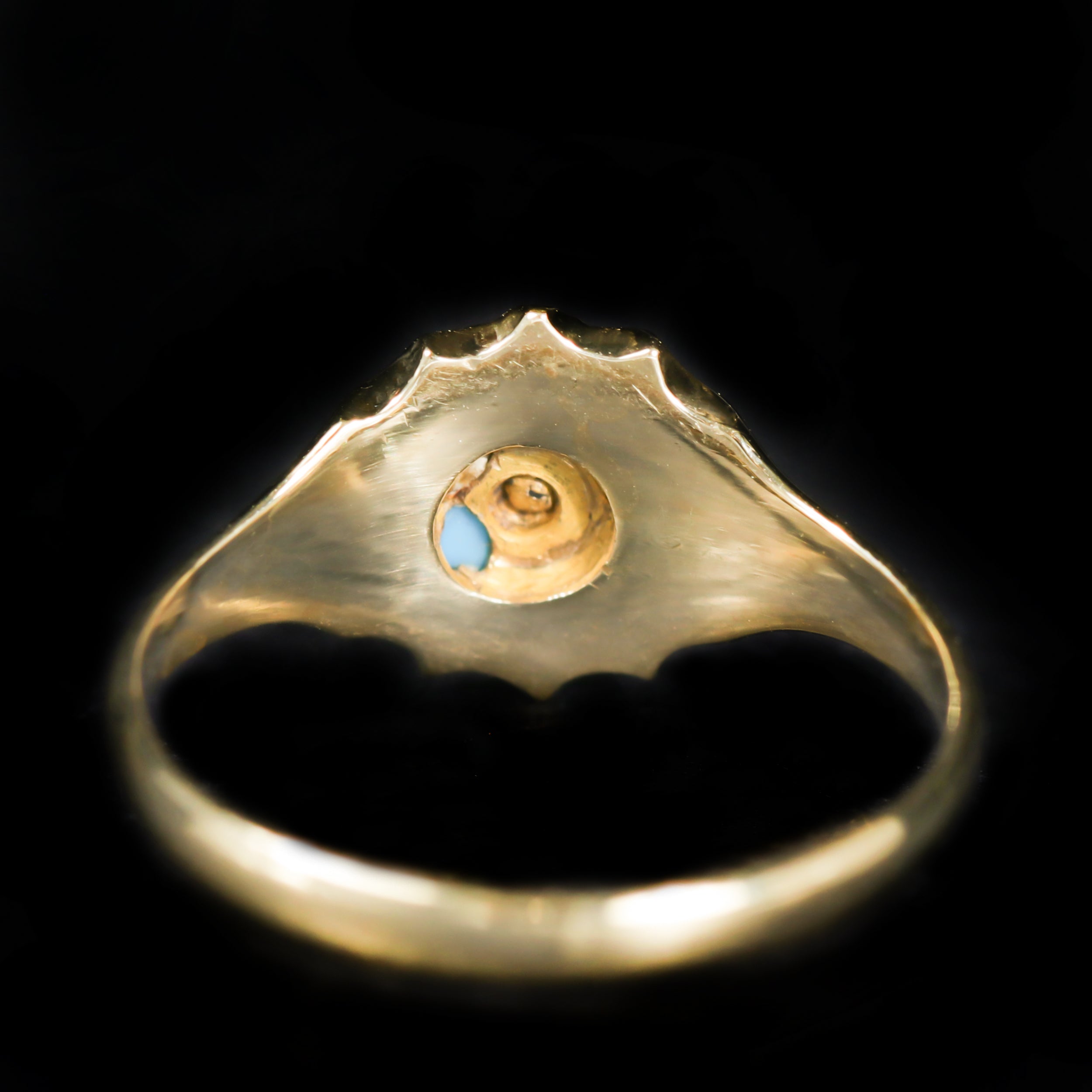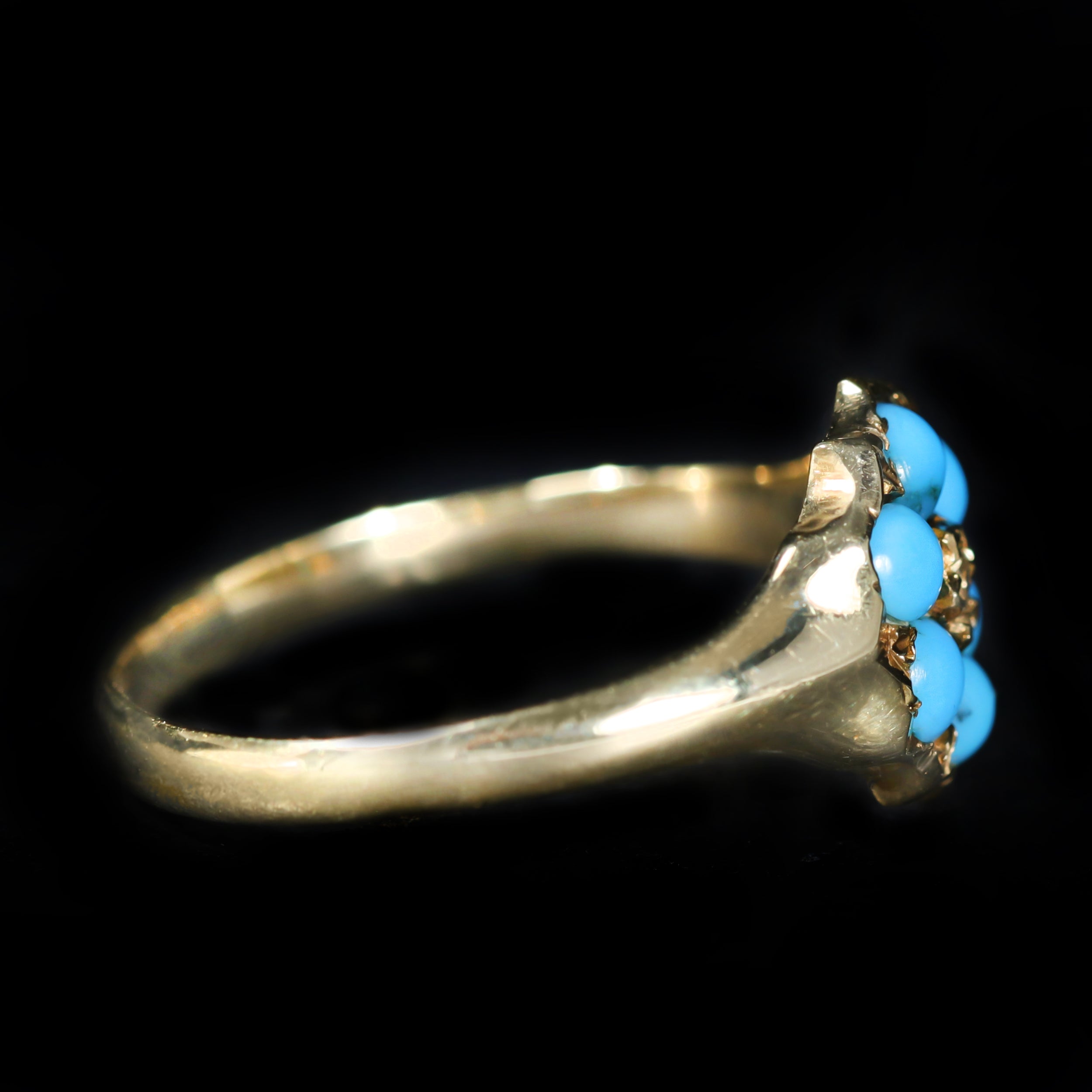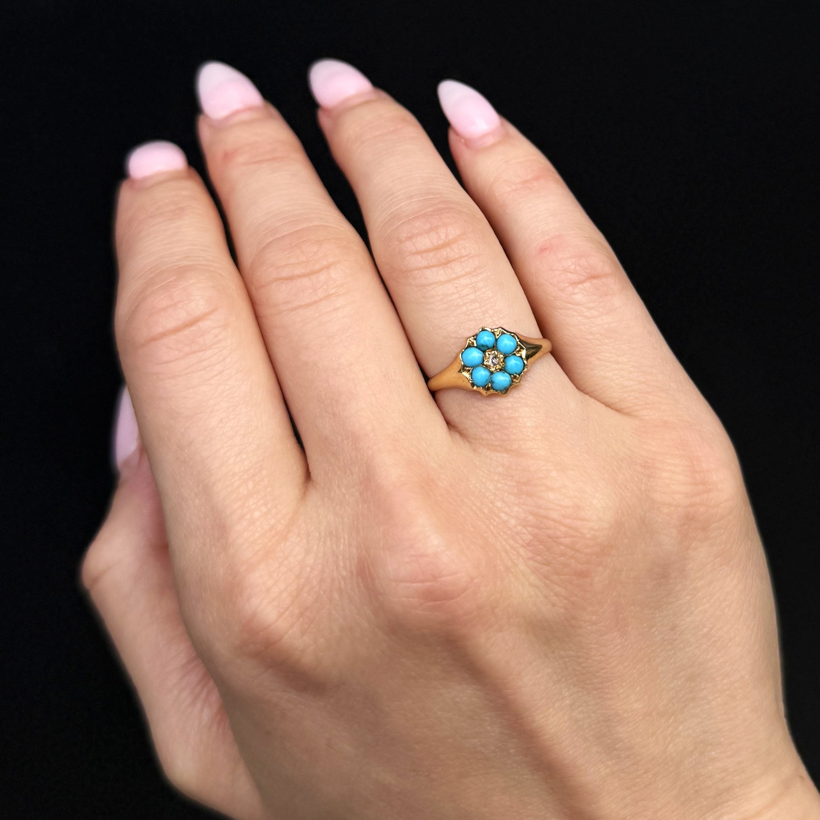 Victorian 14K yellow gold, diamond, and turquoise ring. Delicate and full of sentiment, this antique Victorian ring showcases a luminous rose cut diamond at the center of a vibrant turquoise cluster, all set in warm yellow gold. The design resembles a forget-me-not flower, a cherished Victorian symbol of lasting love, fidelity, and remembrance. Often given as sentimental tokens, forget-me-nots were meant to keep the memory of a loved one close. With its meaningful motif and antique charm, this ring is a timeless tribute to heartfelt connection.