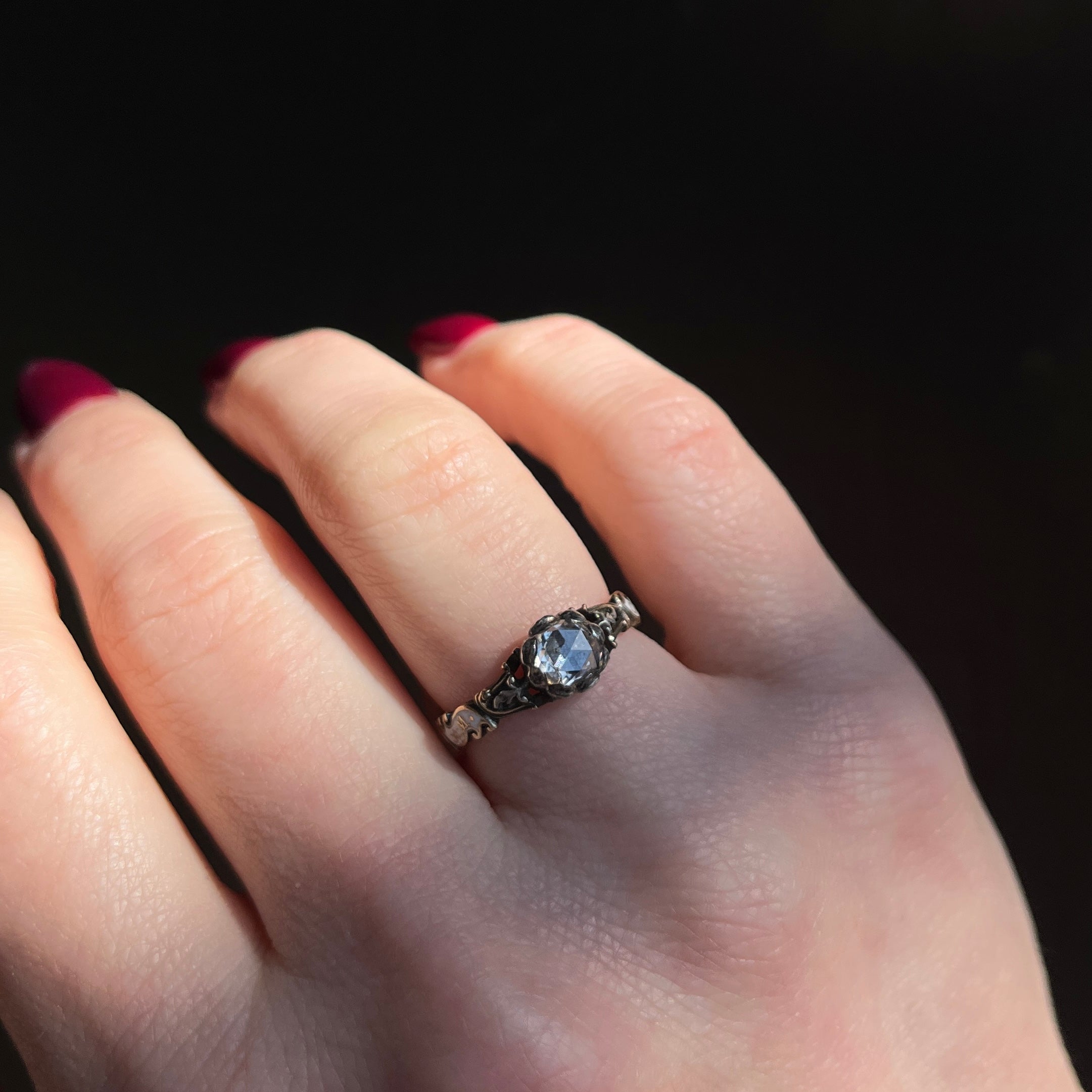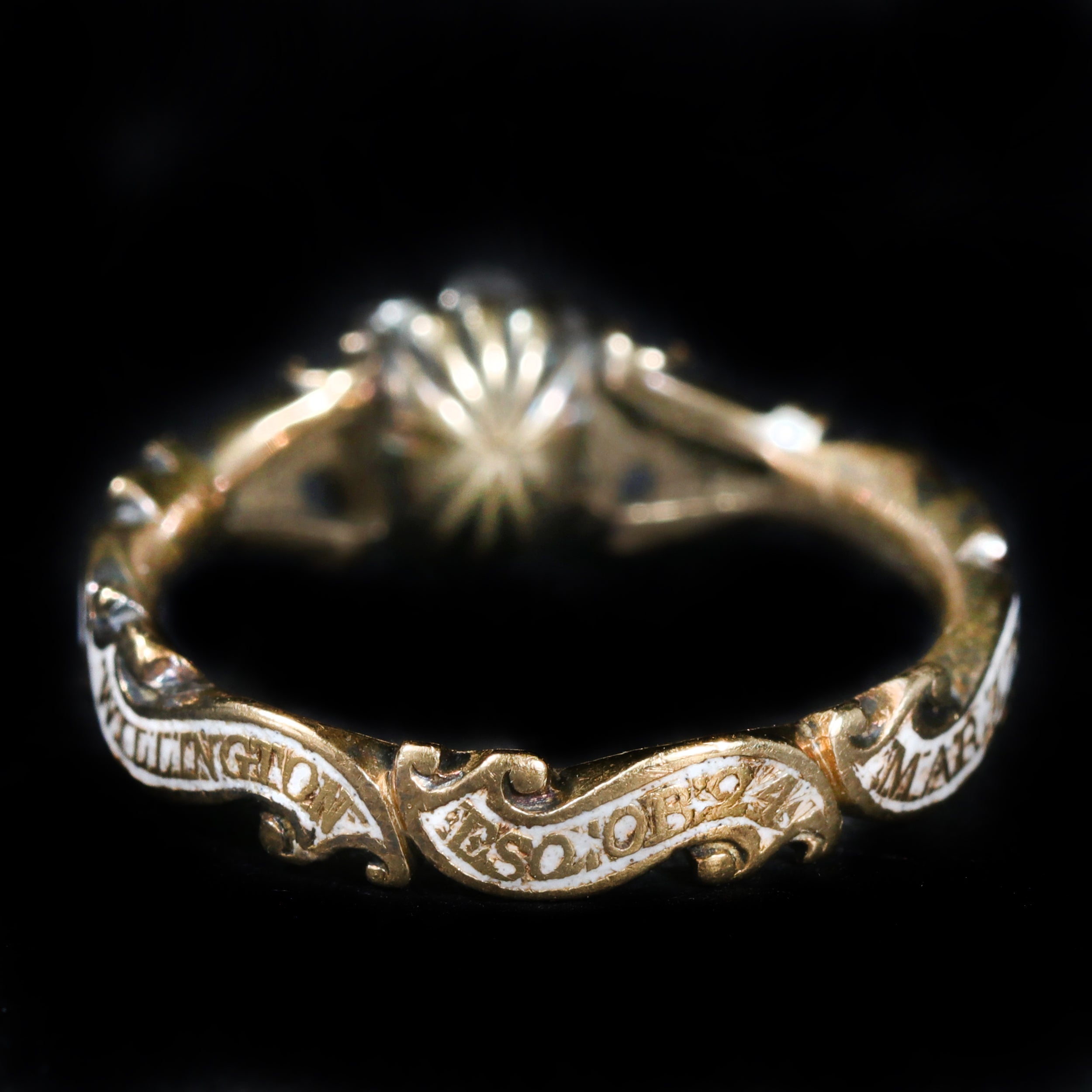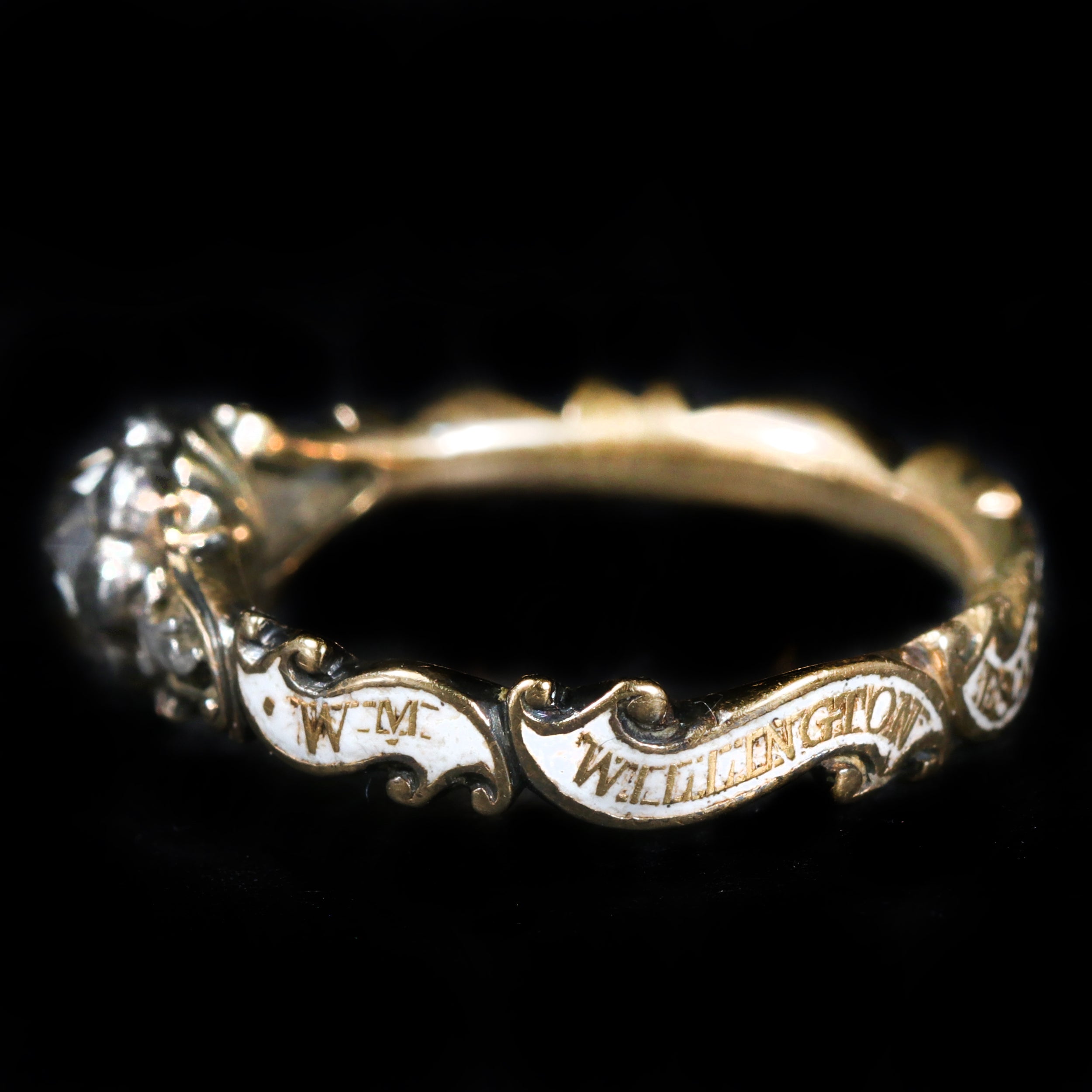 Georgian silver/18k yellow gold and diamond ring. Delve into a poignant piece of history with this treasure steeped in both elegance and sentiment. Crafted during the Georgian era, this ring bears witness to a tale of love and loss, its design embodying the solemn beauty of mourning jewelry. Set in silver-topped 18k yellow gold, the ring features a beautiful rose-cut diamond with shimmering facets. Adorning the band is white enameling, framing the inscription that tells the story of William Willington, Esquire. The inscription reads: "WM 'Willington ESQ OB 24 MAR 1752 AE:30," a solemn tribute to a life cut short. White enameling used during this time would typically represent women, children, or the unmarried. William's legacy is deeply entwined with history, as records trace his lineage back to the English Civil War and the siege of Tamworth Castle. As the son of Waldive Willington of Hurley Hall, his family's heritage is one of honor and courage, with connections to Oliver Cromwell's Royalist Garrison. This ring, crafted in memory of William's untimely passing at the age of 30, is a testament to the enduring bond between loved ones. It is a museum-quality ring, a rare piece of jewelry that offers a glimpse into the past and the lives of those who came before us. As such, it cannot be resized or repaired in any manner. Extreme care must be taken when wearing it.