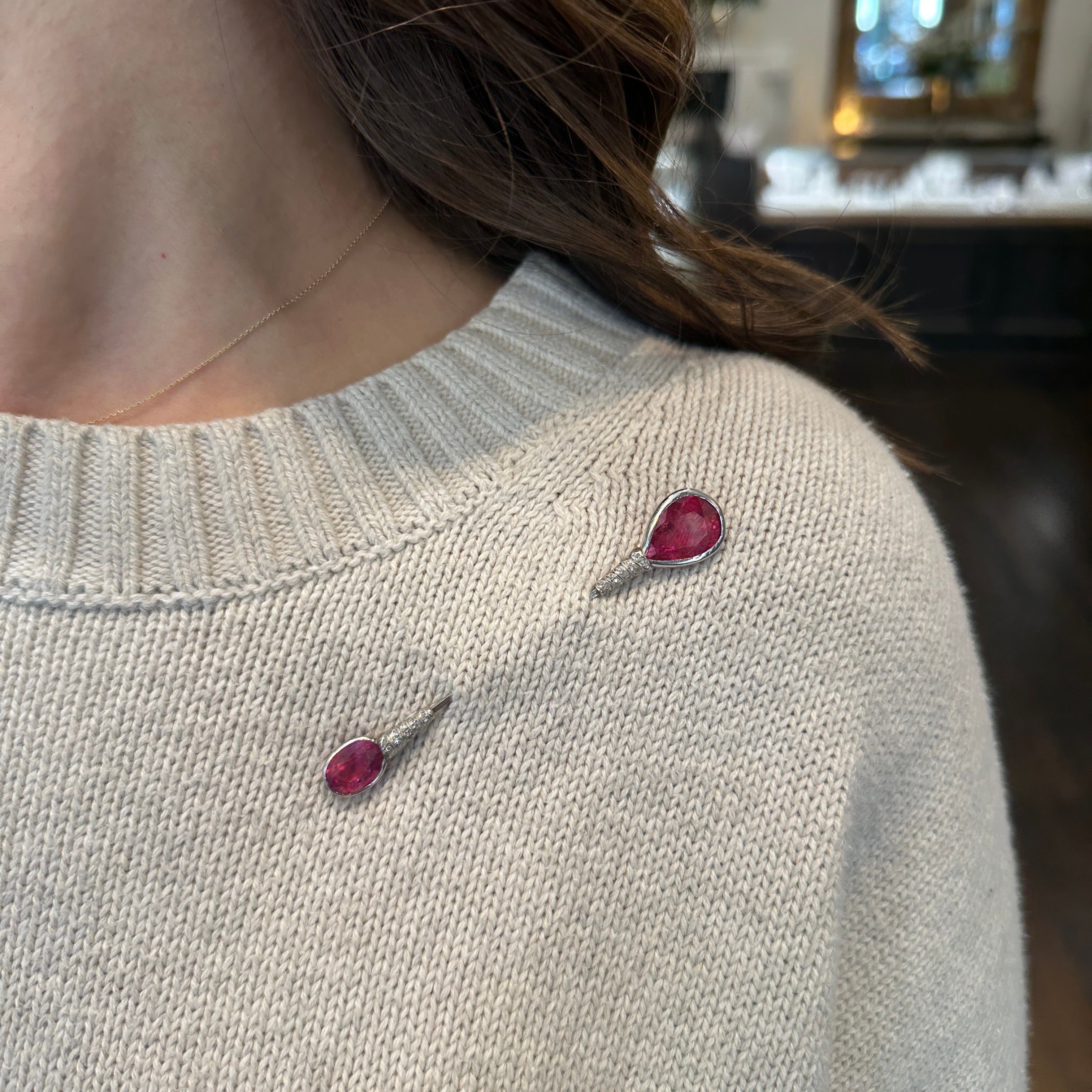 Art Deco platinum, rubellite, and diamond jabot pin. A timeless piece that harks back to the elegance of the 1920s and 1930s, the jabot pin originated in the mid-seventeenth century as a functional yet ornate accessory for men's ruffled shirts, and found new life in the Art Deco era with its distinctive designs. This particular jabot pin showcases the striking beauty of two rubellite—one a large pear-cut gem weighing approximately 8 carats, and the other an oval-cut rubellite weighing approximately 3.56 carats. These vibrant, bezel-set gemstones are framed by delicate swirling motifs, accented with glittering single cut diamonds that enhance the overall sophistication of the piece.