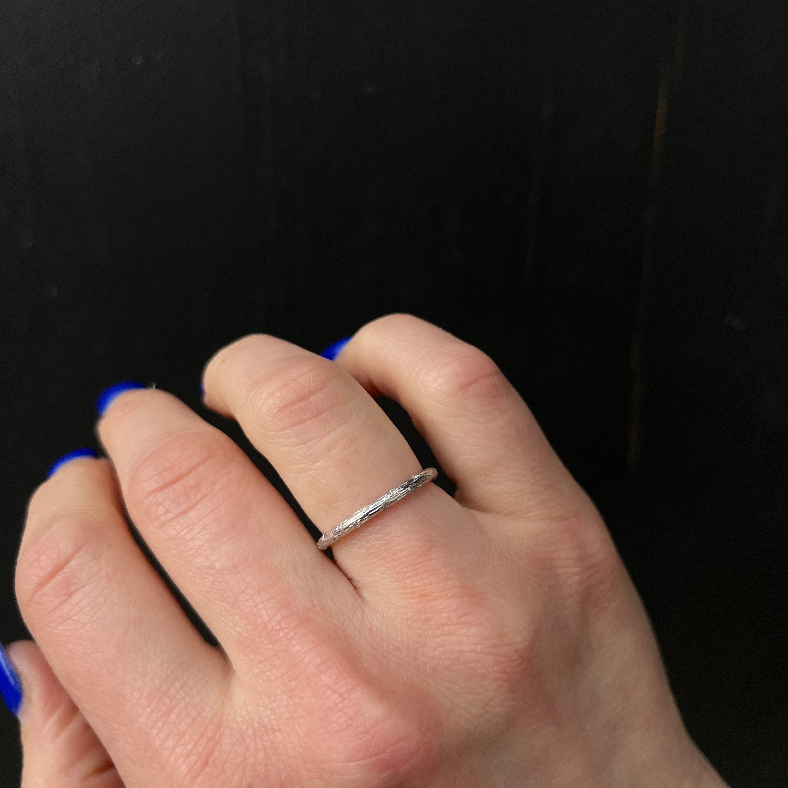 18k white gold and diamond band. This stunning diamond band features a unique scatter design, where diamonds are artfully placed across the band to create a stunning, sparkling effect. The diamonds, set against the rich backdrop of 18k white gold, catch the light beautifully. The band is adorned with intricate engraved line details, adding texture and depth to the design and showcasing the exquisite attention to detail.