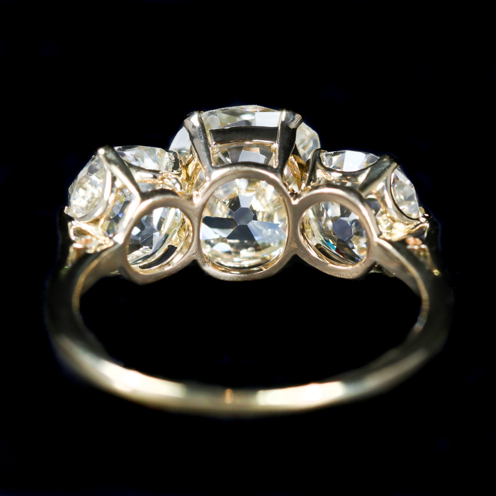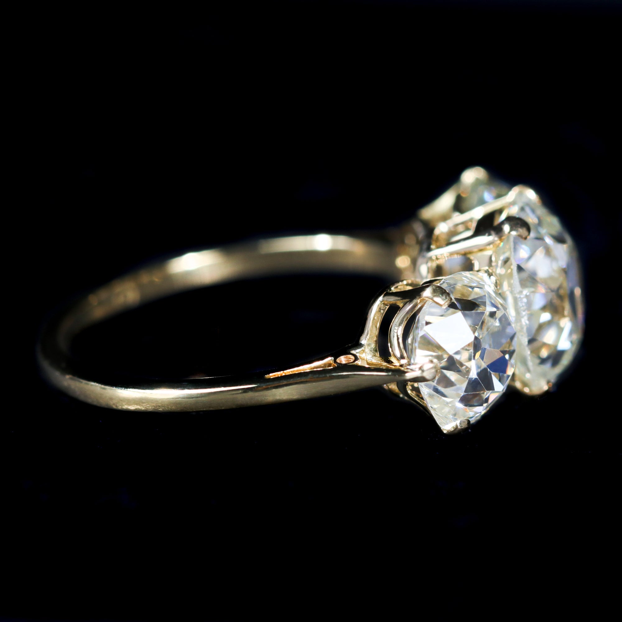 Estate 18k yellow gold and diamond ring. A remarkable three-stone engagement ring with London hallmarks dating to 1962, this vintage treasure showcases 5.61 carats of Old Mine cut diamonds—each accompanied by a GIA Diamond Report. The center diamond weighs 2.76 carats, flanked by two impressive companions weighing 1.47 carats and 1.38 carats. Though the ring itself was crafted in the mid-20th century, the Old Mine cuts were likely cut many decades earlier, their broad facets and gentle sparkle carrying the romance of the 18th and 19th centuries. Set in a classic 18k yellow gold three-stone mounting, the design allows each antique diamond to shine while celebrating their historic character. A rare find that bridges eras, this ring is both an heirloom of the past and a statement for the future.