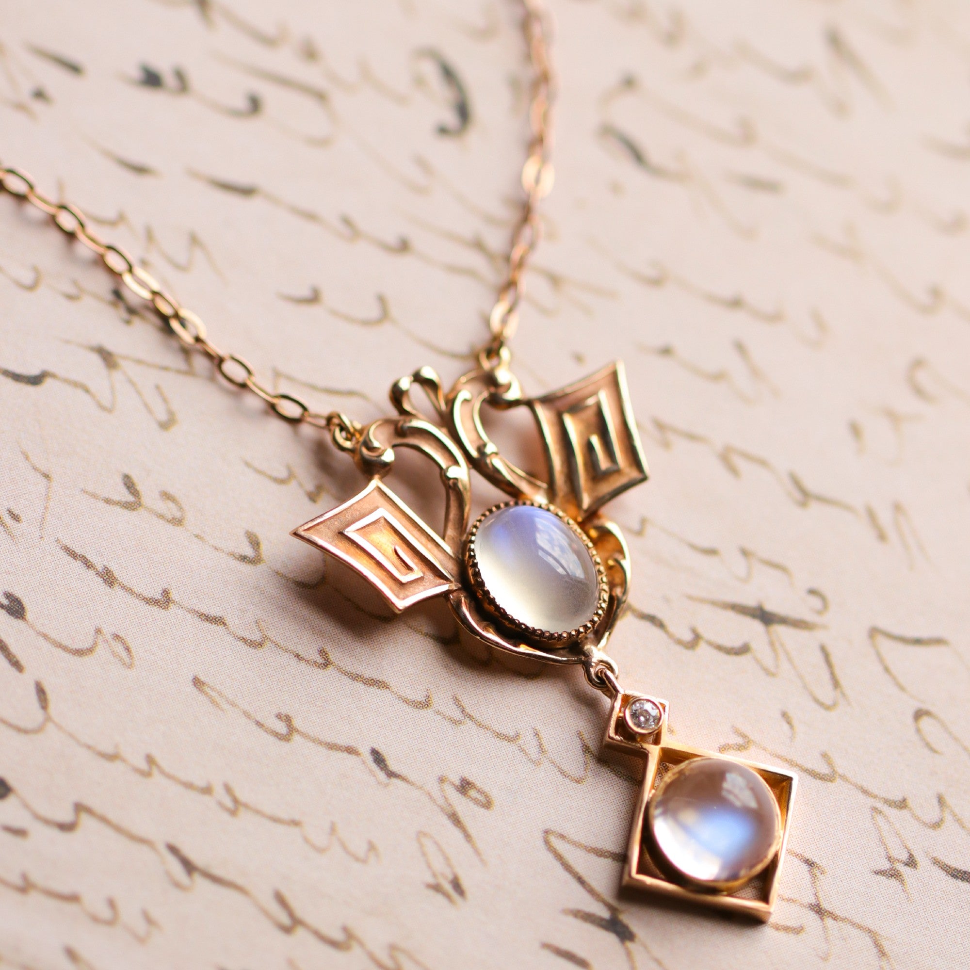 Arts & Crafts 14K yellow gold, moonstone, and diamond necklace. A rare treasure from the Arts & Crafts era, this 14k yellow gold necklace showcases a striking geometric pendant set with two luminous moonstones—one oval, one round—and a single Old Mine cut diamond nestled between. The handcrafted design reflects the movement’s hallmark emphasis on artistry over mass production, with bold lines, organic forms, and a distinctly architectural feel. The moonstones glow with ethereal light, while the antique diamond adds just the right touch of brilliance. A one-of-a-kind piece that embodies the spirit of craftsmanship and individuality.