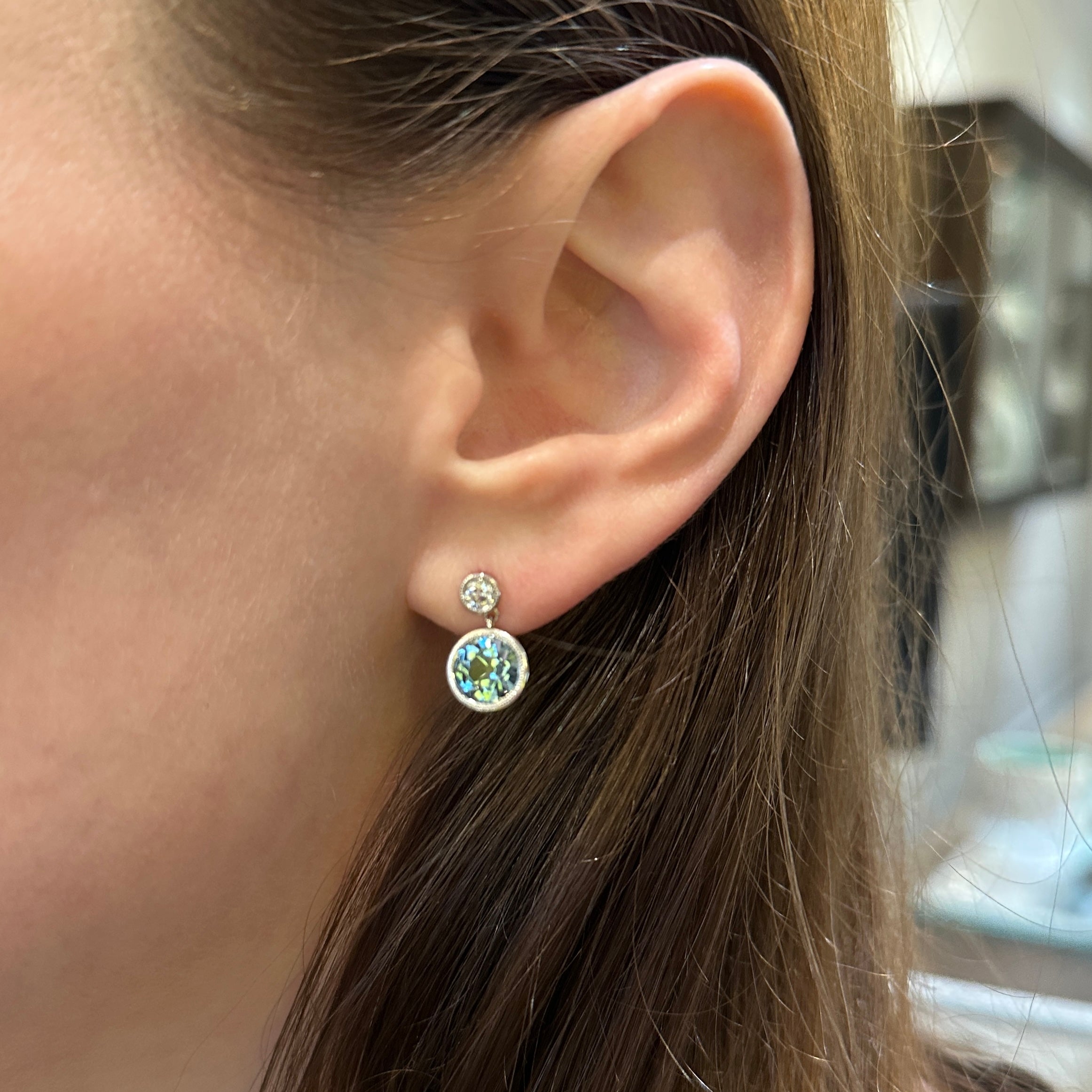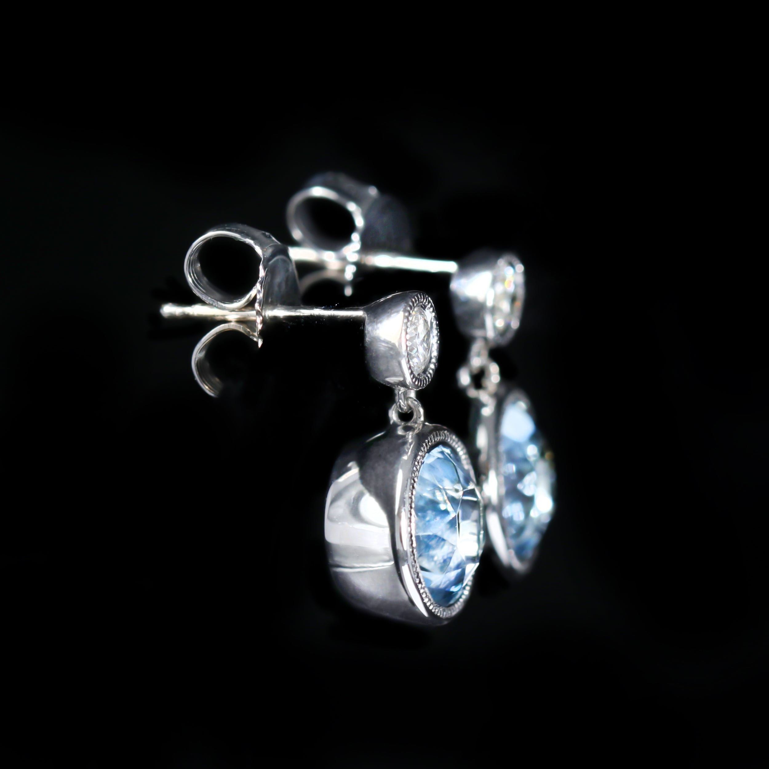 18k white gold, diamond, and aquamarine earrings. These exquisite earrings feature a dazzling, bezel-set diamond stud. Dangling below are custom European cut aquamarines, their soft, sea-blue hues beautifully showcased within delicate milgrain-edged bezels. The articulating design adds a graceful movement, making these earrings the perfect understated luxury staple in your collection.