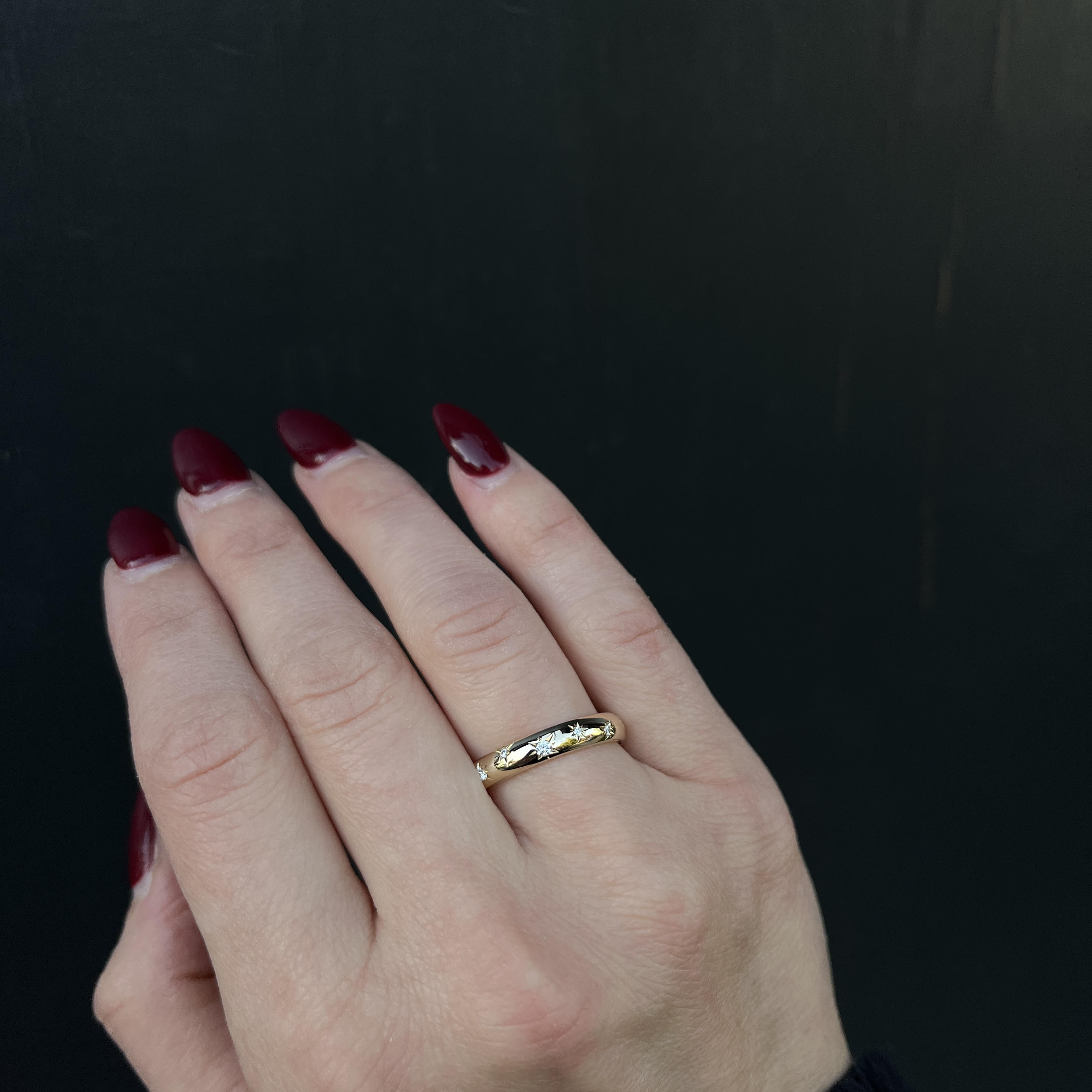 14k yellow gold and diamond band. This delightful 14k yellow gold band features eight round brilliant cut diamonds, each nestled within charming star-shaped settings. Scattered across the top half of the slightly domed band, the diamonds add a subtle sparkle that catches the light with every movement.