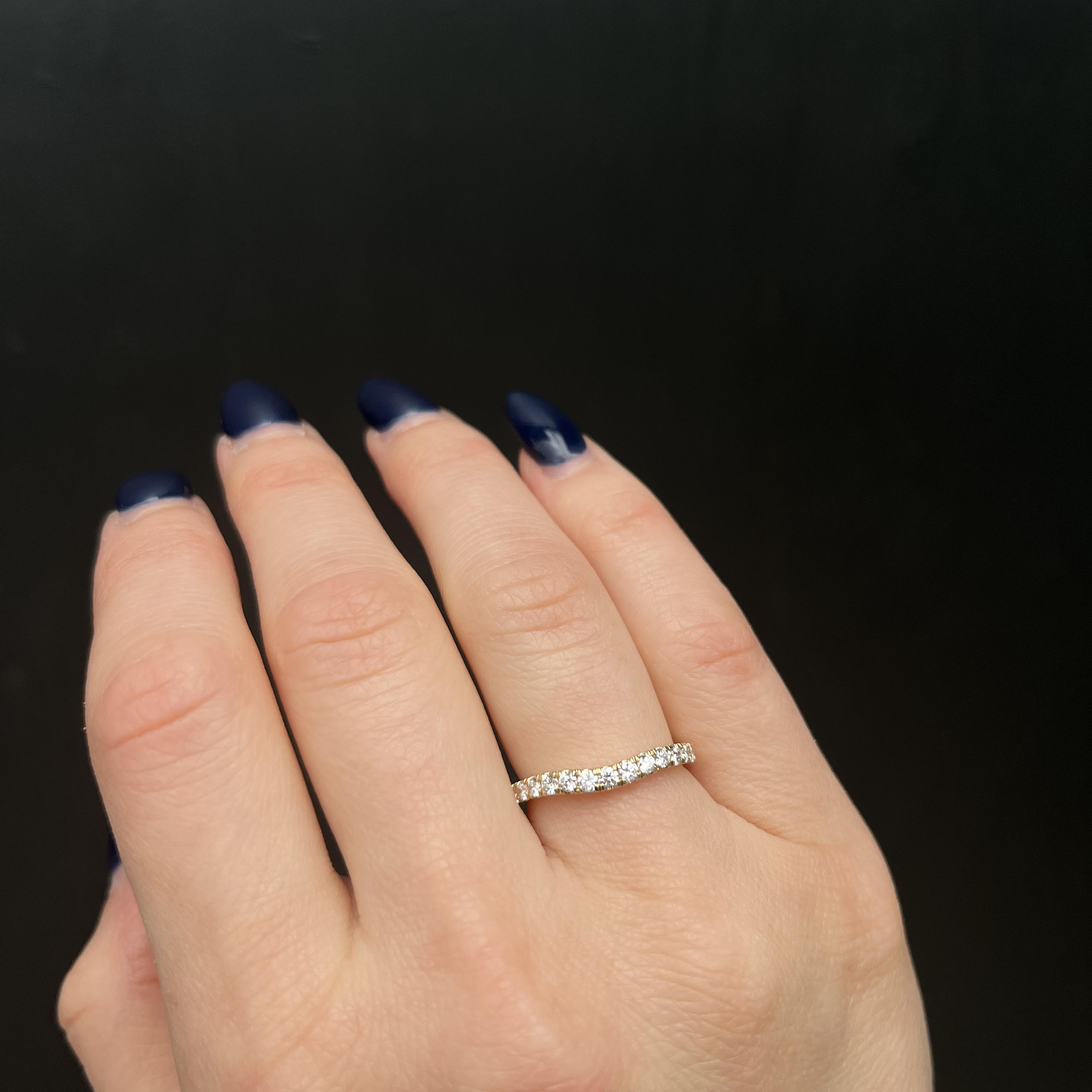 14k yellow gold and diamond band. This elegant 14k yellow gold curved band sparkles with fifteen round brilliant cut diamonds, gracefully set halfway around the band. The curved design makes it a perfect companion to an engagement ring or a stylish addition to a stack. The warm yellow gold beautifully complements the brilliance of the diamonds, creating a timeless and versatile piece that exudes refined sophistication.