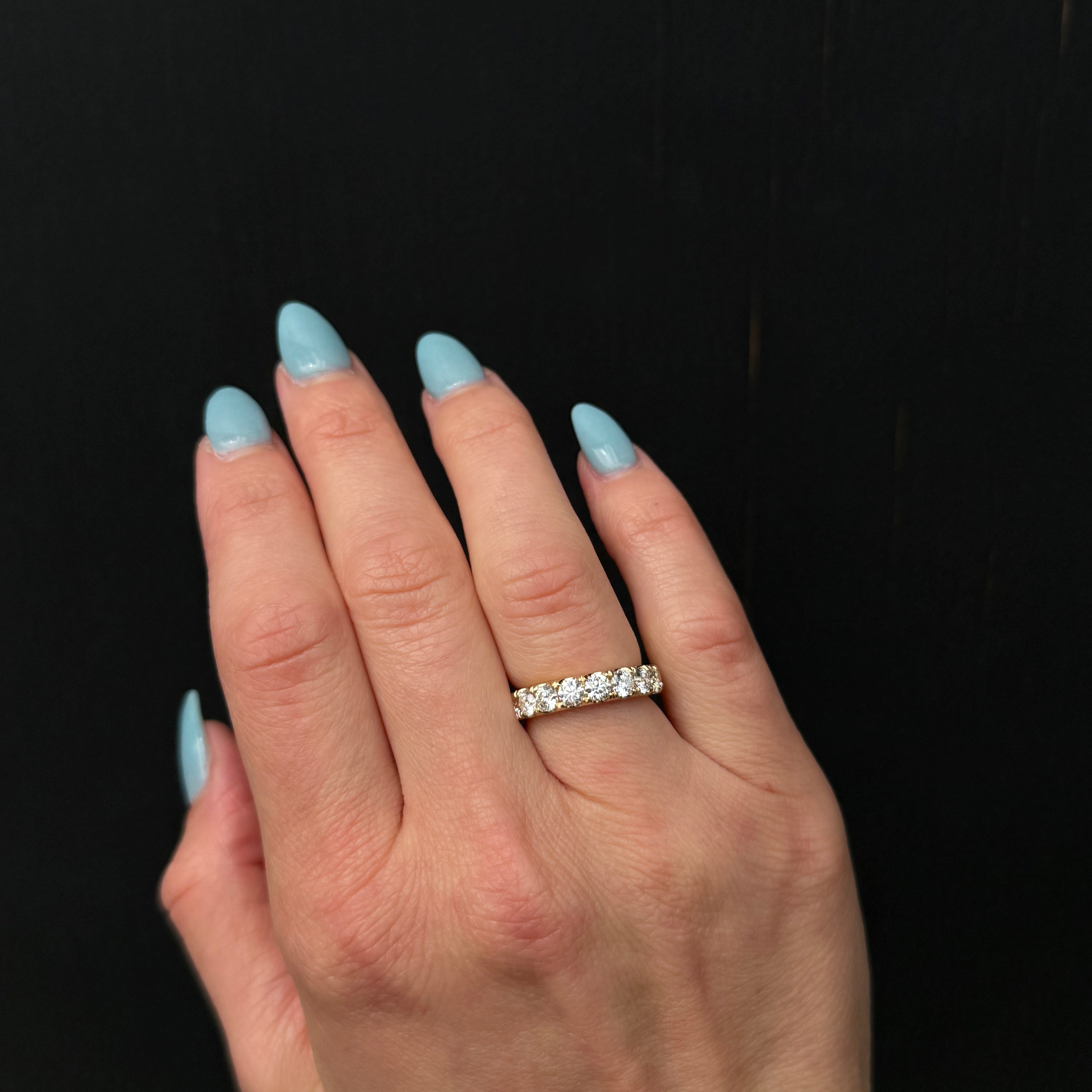 14K yellow gold and diamond band. This beautiful diamond band makes a timeless addition to any wedding set or the perfect stackable next to any ring in your jewelry box. Nine round brilliant cut diamonds, totaling 1.52 carats, cascade across the top half in a prong setting