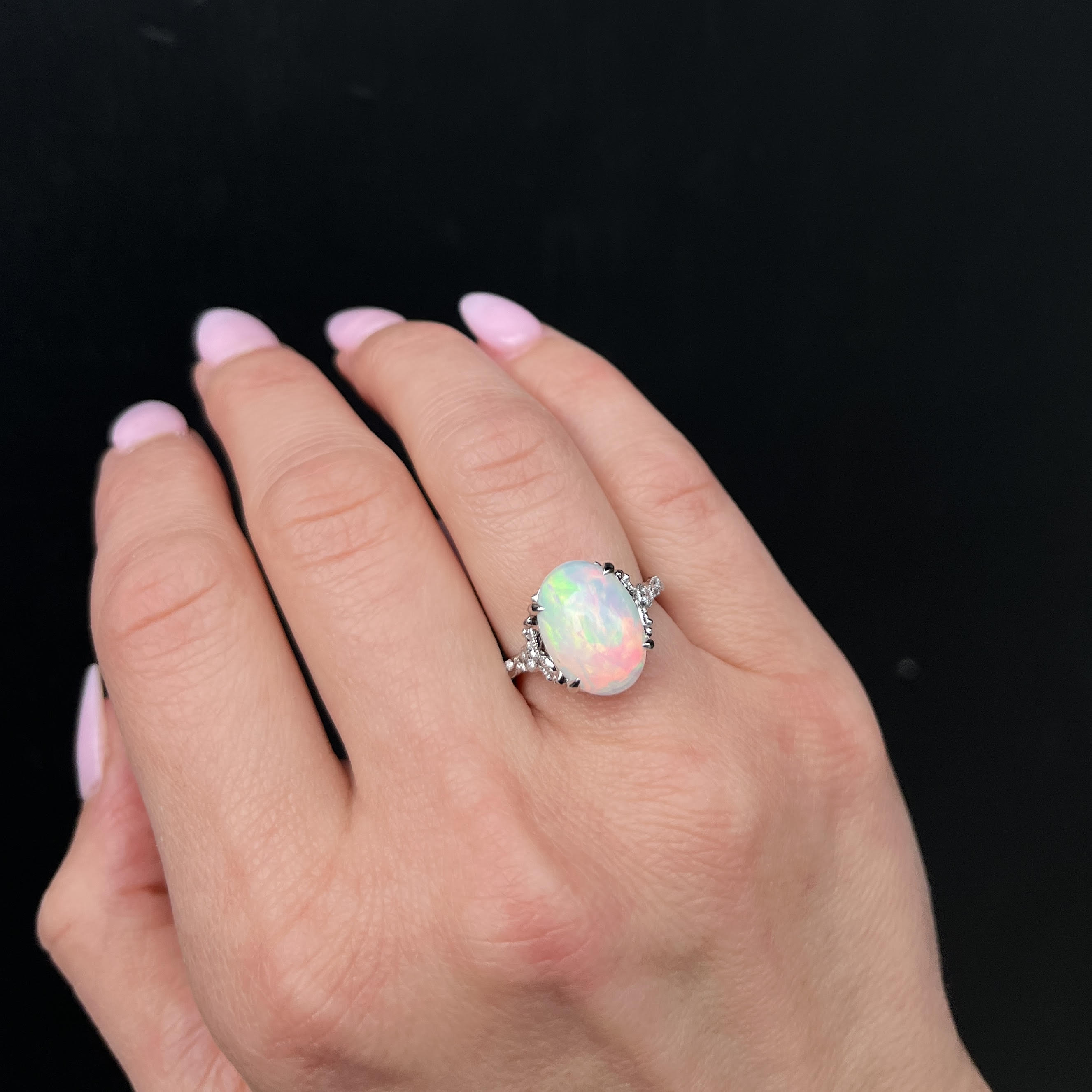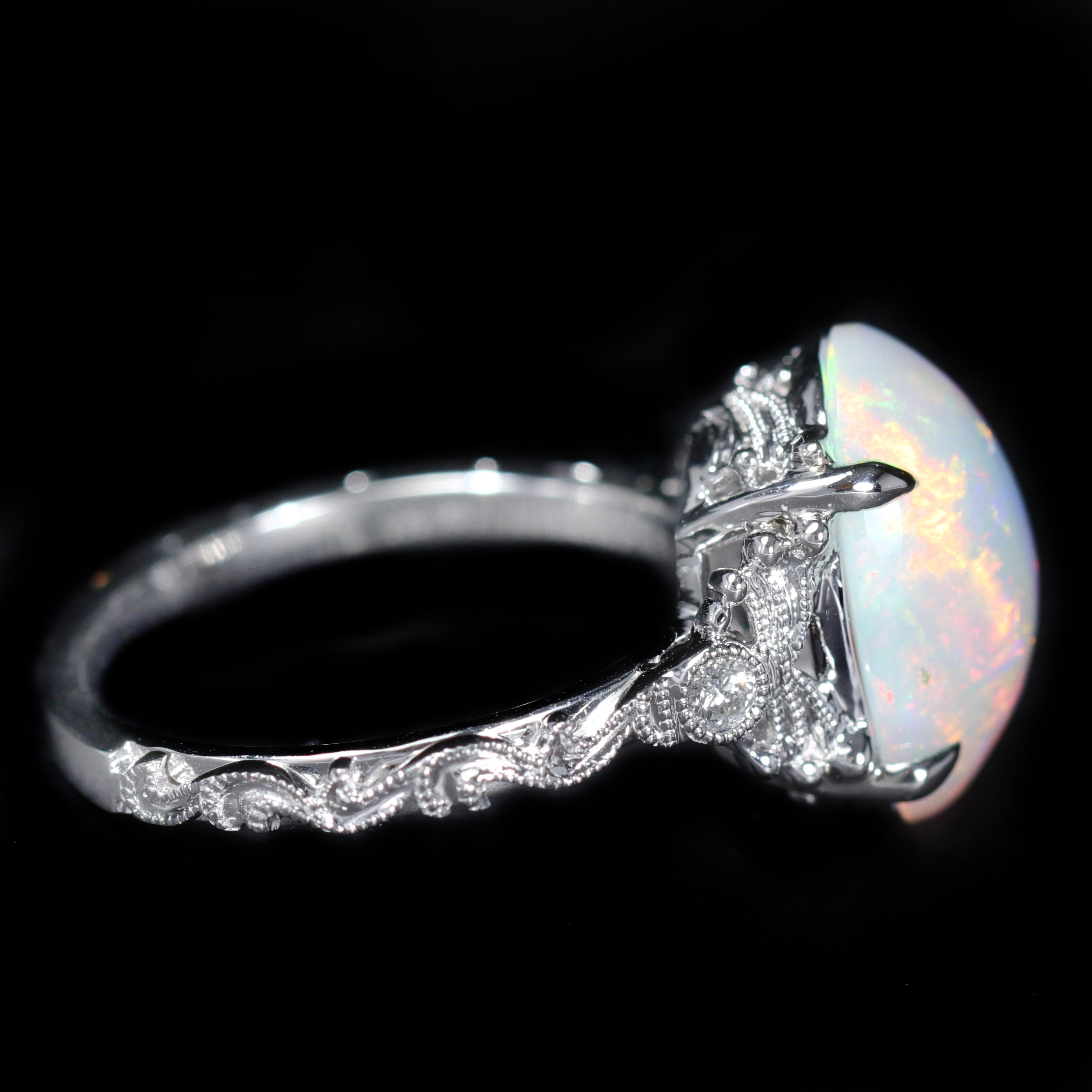 14K white gold, opal, and diamond ring. A vibrant 2.92 carat opal takes center stage in this stunning ring, with electric flashes of orange and green that light up the stone. The intricate white gold setting creates the perfect backdrop, with a diamond adorning each shoulder for a touch of sparkle. Vintage-inspired milgrain scrolls trail delicately down each side of the band, giving the ring a timeless, one-of-a-kind charm.