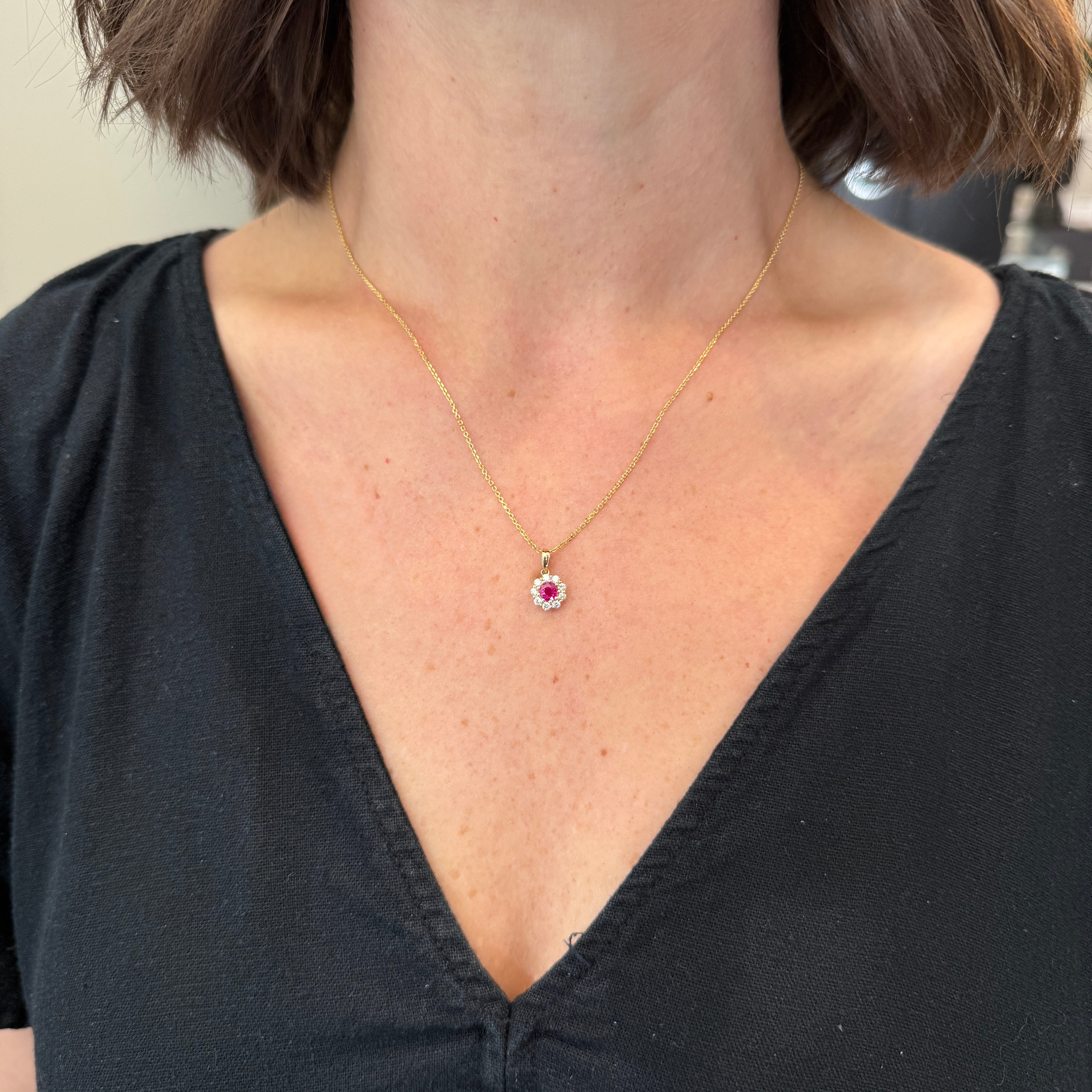 14K yellow gold, ruby, and diamond pendant. Crafted in 14K yellow gold, this pendant centers a richly hued round ruby, secured in a 9-prong setting that highlights its vibrant color and classic cut. Surrounding the ruby, a scalloped halo of 9 round brilliant cut diamonds adds a lovely sparkle. The pendant is finished with a polished, tapered gold bail. Chain sold separately.