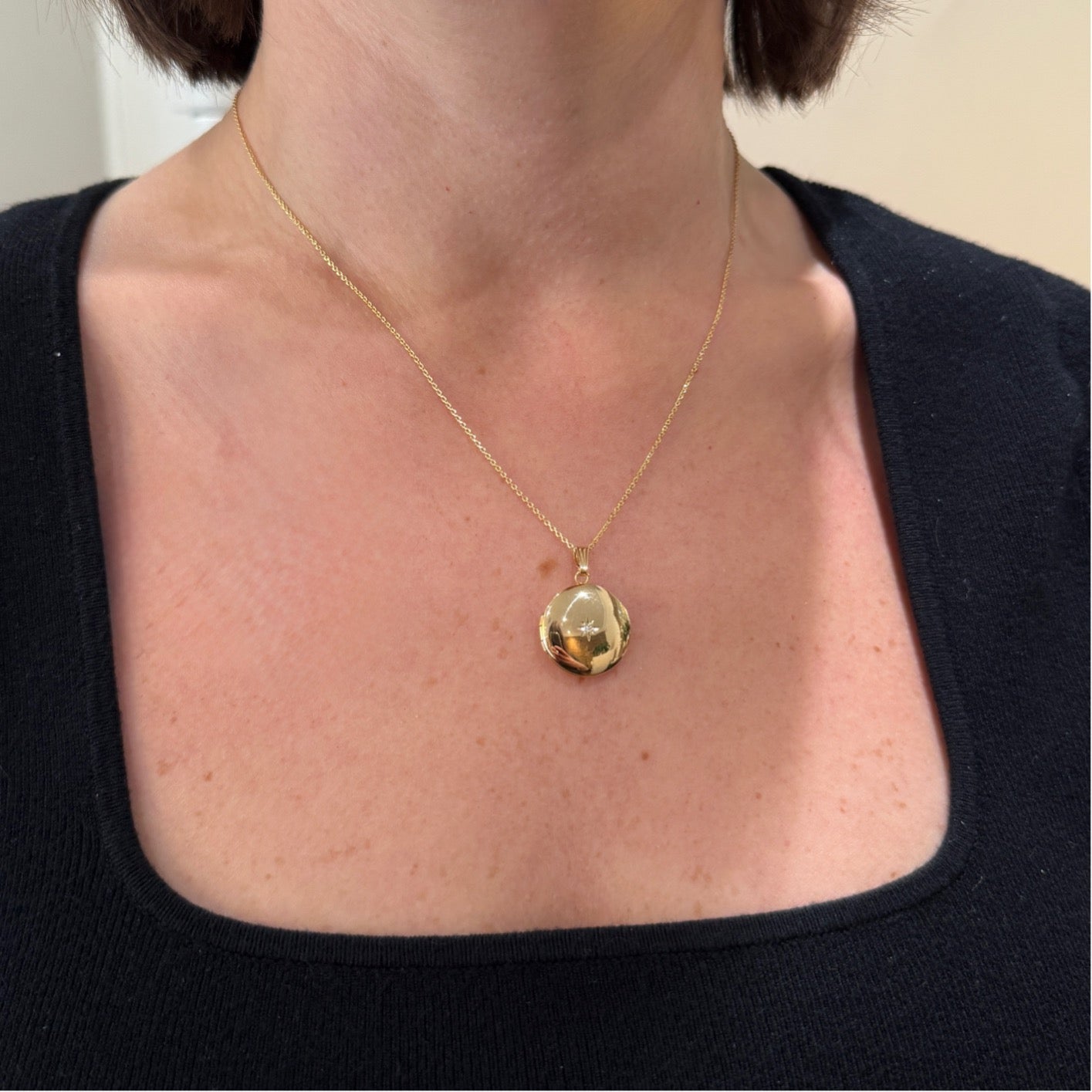 14K yellow gold and diamond locket pendant. Crafted in 14K yellow gold, this locket is designed with both elegance and sentiment in mind. A single sparkling round diamond is star-set at the center, adding a subtle twinkle to the gleaming, polished surface. The locket opens to reveal two interior compartments, perfect for holding a small portrait or treasured memento. Finished with a tapered bail, this piece is timeless in style and rich with personal meaning. Chain sold separately.