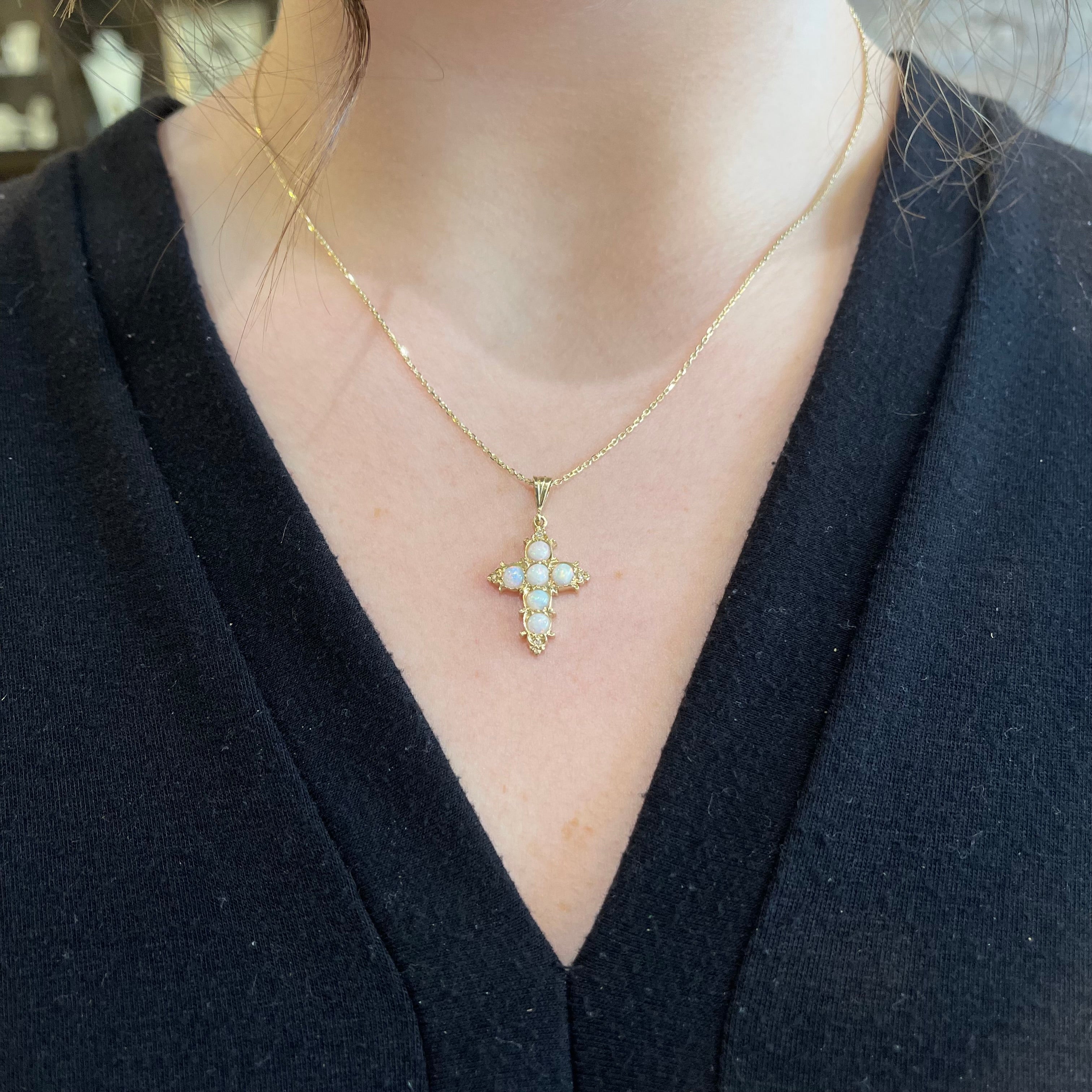 14K yellow gold opal and diamond pendant. This lovely antique inspired cross features six vibrant opals embraced by the delicate sparkle of four twinkling diamonds. Meticulously crafted in radiant yellow gold, this graceful piece exudes femininity and elegance, making it the perfect accessory for any occasion.