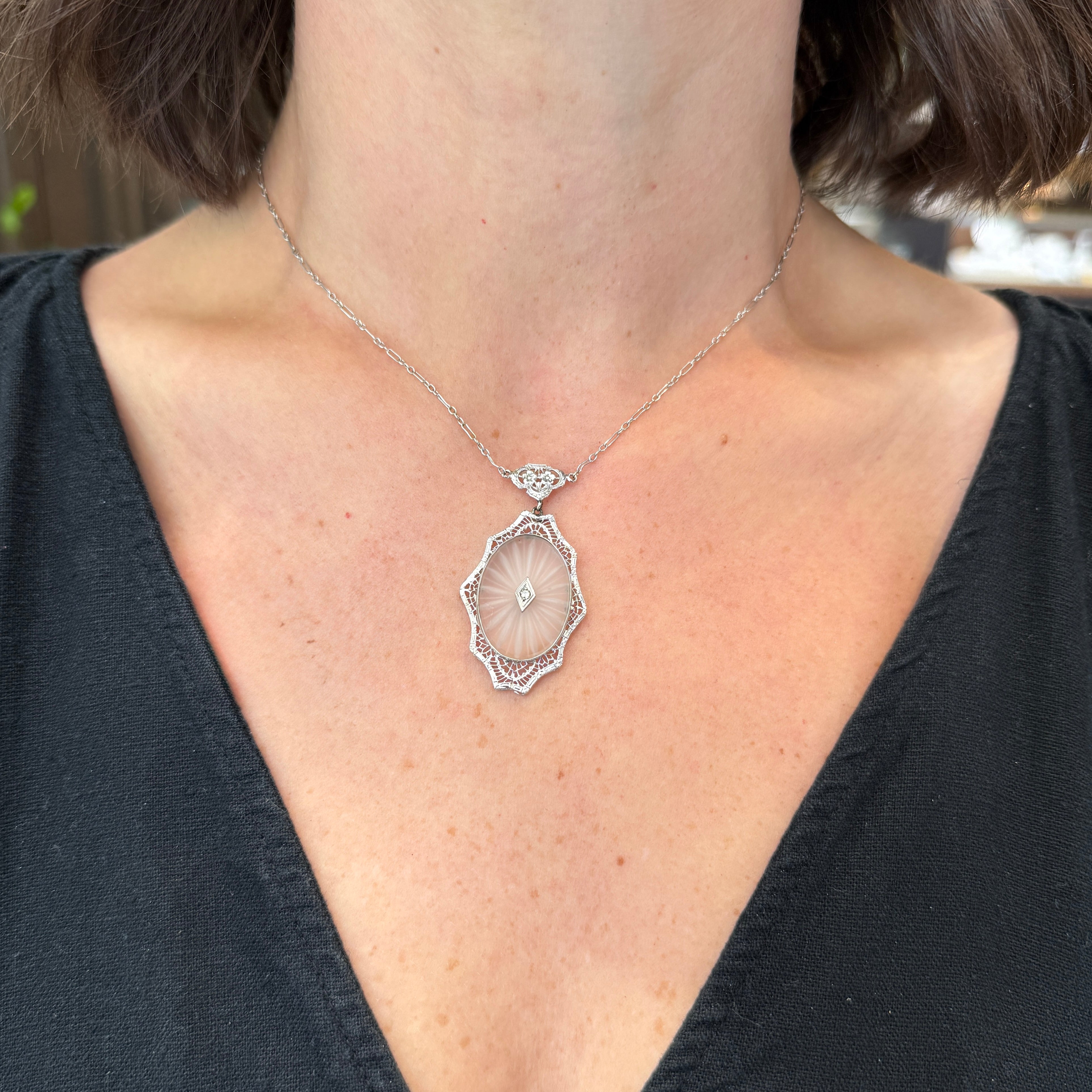 Art Deco 14k white gold, diamond, and camphor glass necklace. This unique Art Deco design features an oval camphor glass pendant framed by a striking scalloped filigree border. The misty, star-patterned glass—designed to mimic carved rock crystal—glows softly, with a single cut diamond at its center providing a sparkling accent. A delicate filigree bail suspends the pendant from a 15-inch antique link chain, making this an enchanting piece of 1920s craftsmanship that stands apart with its intricate, lace-like details.