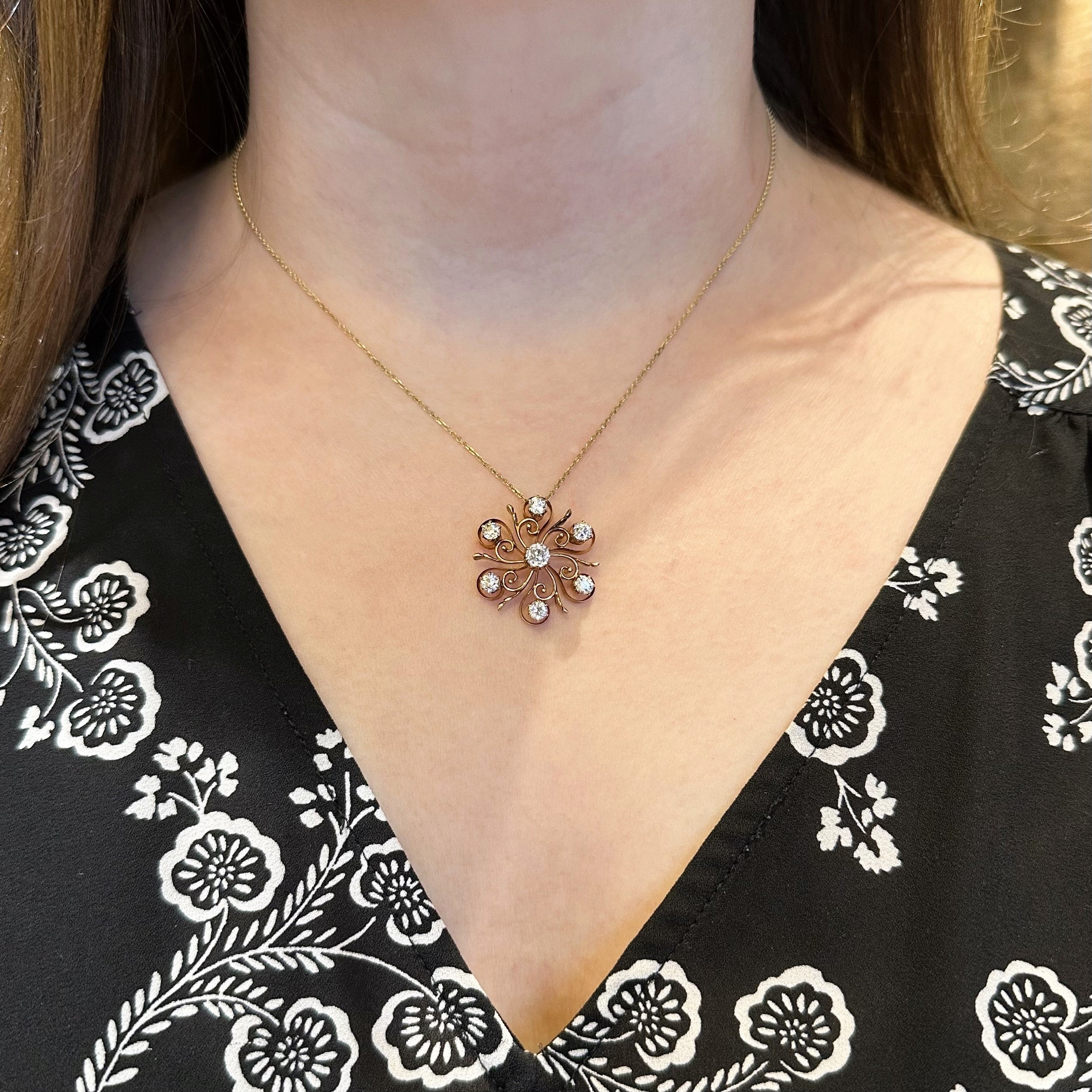 Victorian 14k yellow gold and diamond pendant. A swirling pinwheel of sparkling Old Mine cut diamonds embellish this classic Victorian pendant, suspended from a hidden bail.