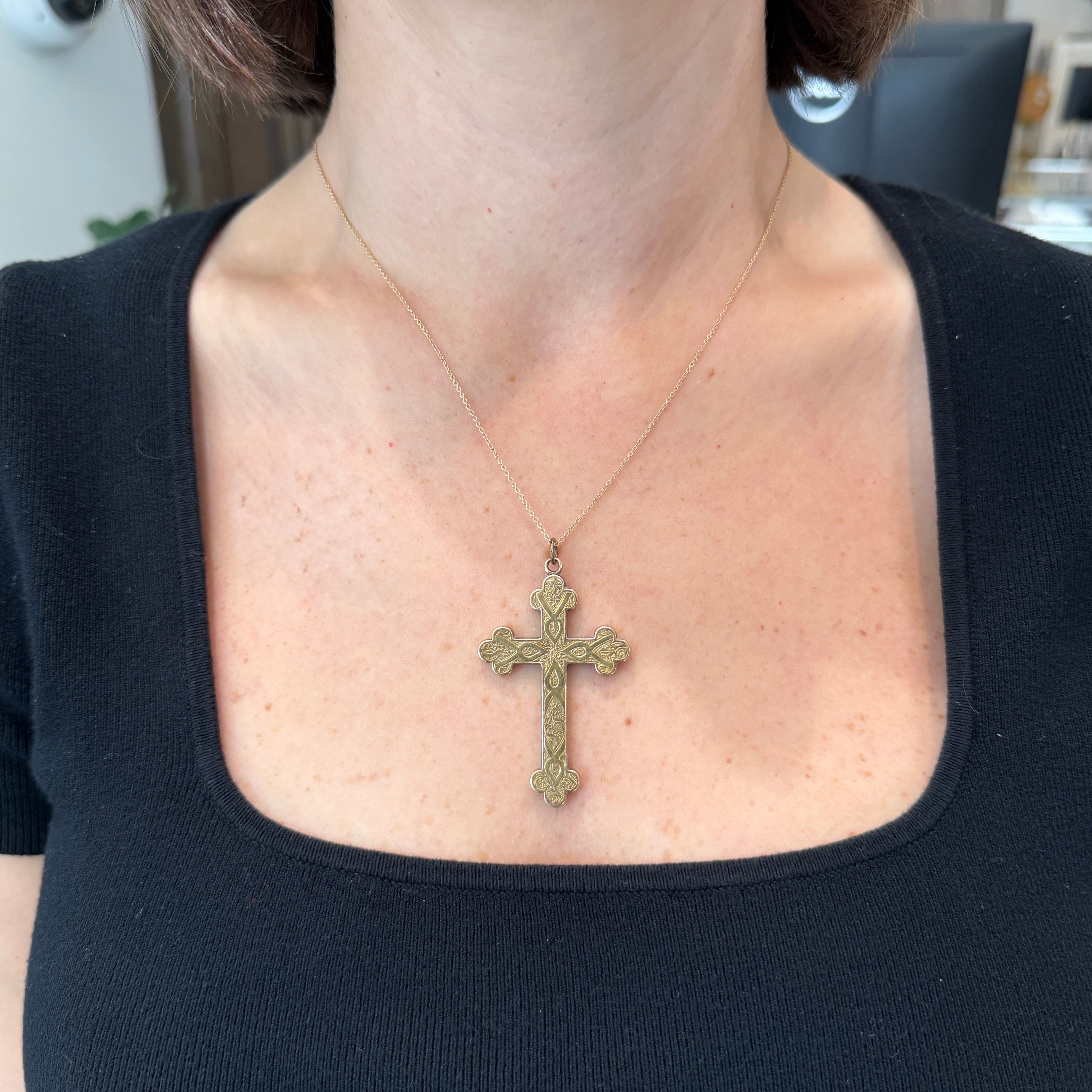 Victorian 9K yellow gold cross pendant. This Victorian cross is a beautiful expression of both craftsmanship and symbolism. Measuring approximately 2.25 inches tall by 1.5 inches wide, the cross features the distinctive trilobed or trefoil ends—each arm terminating in three rounded lobes, representing the Holy Trinity: Father, Son, and Holy Spirit.