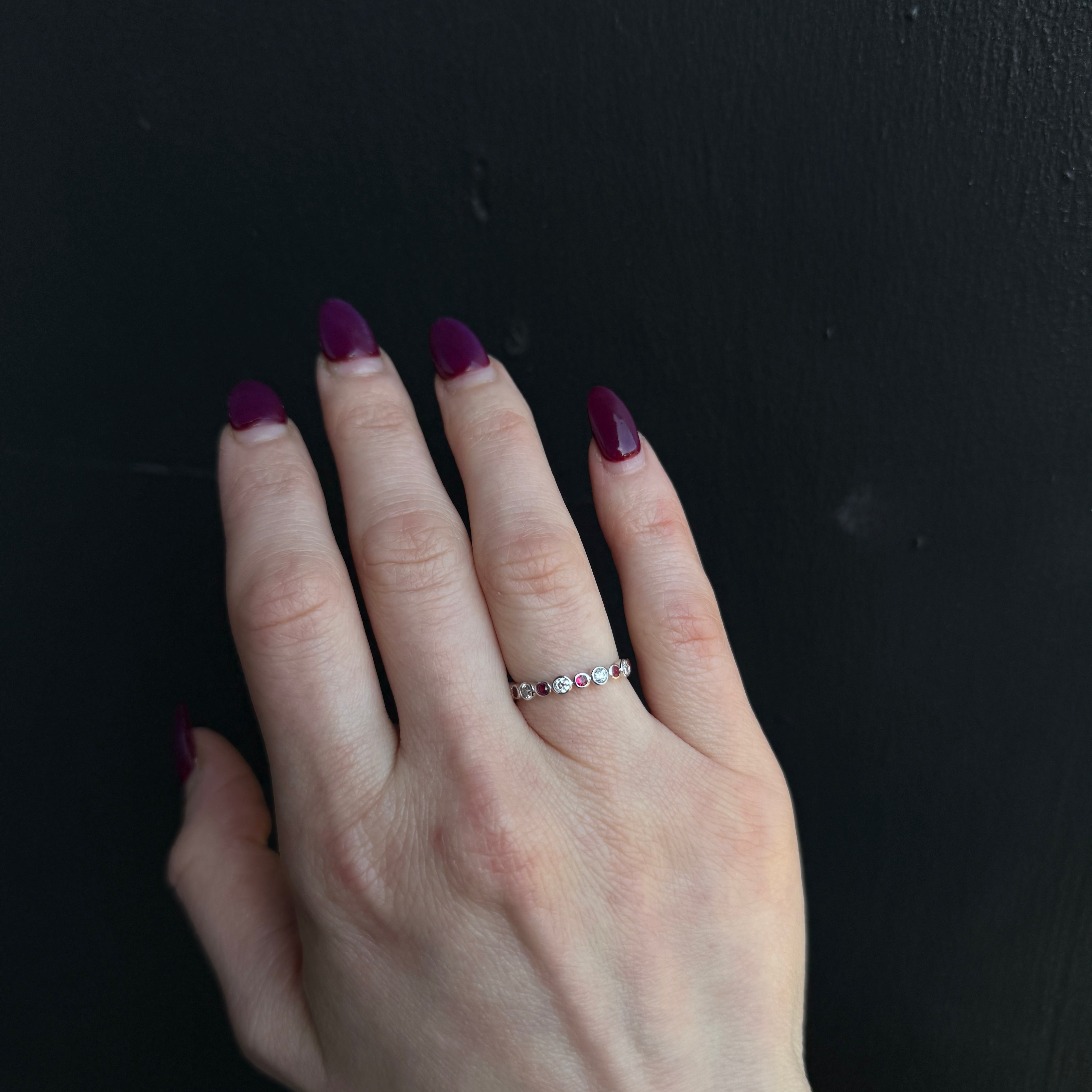 14K white gold, ruby, and diamond band. This 14K white gold band offers a refined balance of color and sparkle, featuring vivid round rubies and dazzling round diamonds. The gemstones are securely set within sleek, polished bezel settings. A timeless choice—perfect worn alone, stacked, or paired with an engagement ring for a pop of color and sophistication.