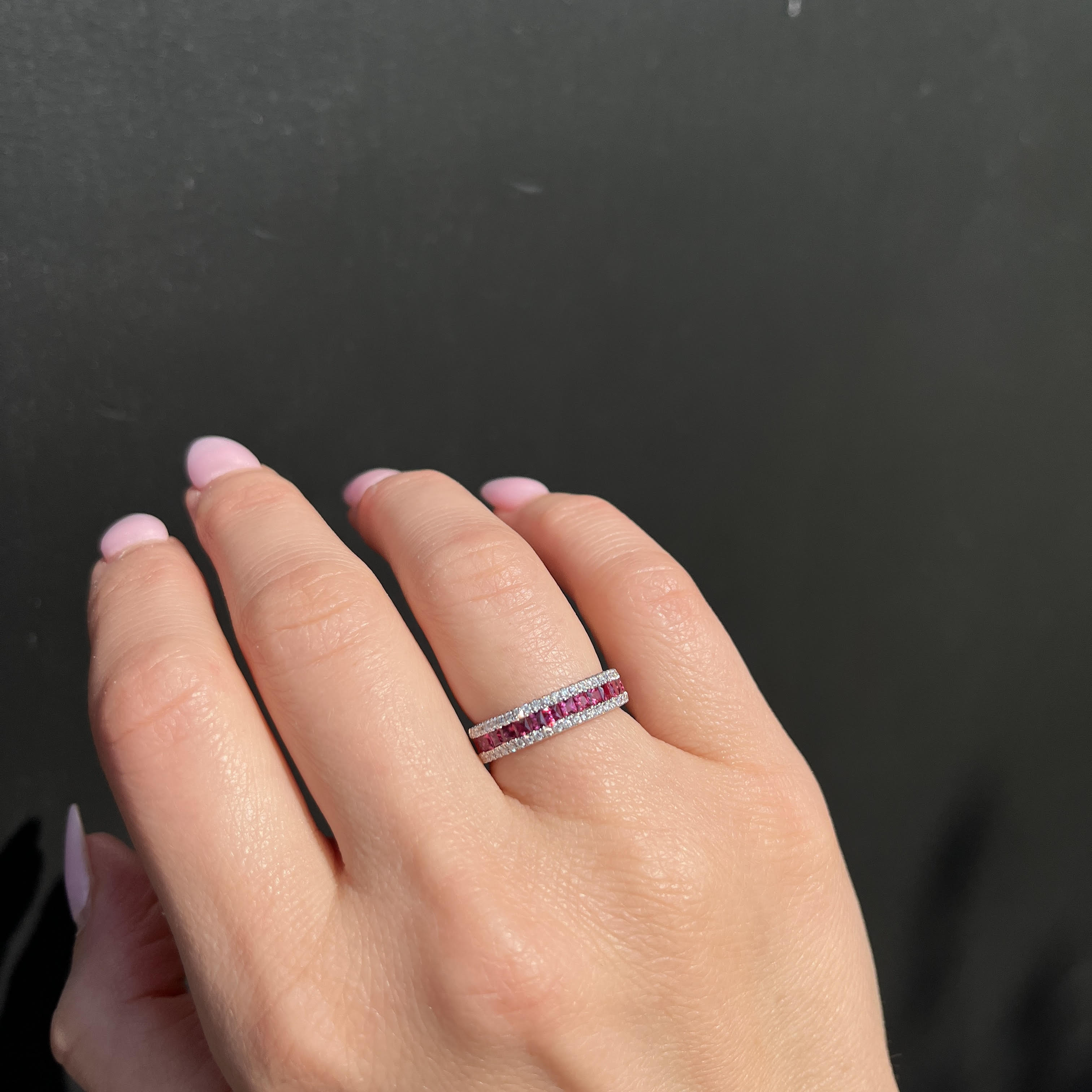 14k white gold, ruby, and diamond band. This stunning band features a striking center row of princess cut rubies, channel set to create a bold and beautiful ribbon of rich red color across the top. Framing the rubies are two rows of round brilliant cut diamonds, creating the perfect balance of color and brilliance.
