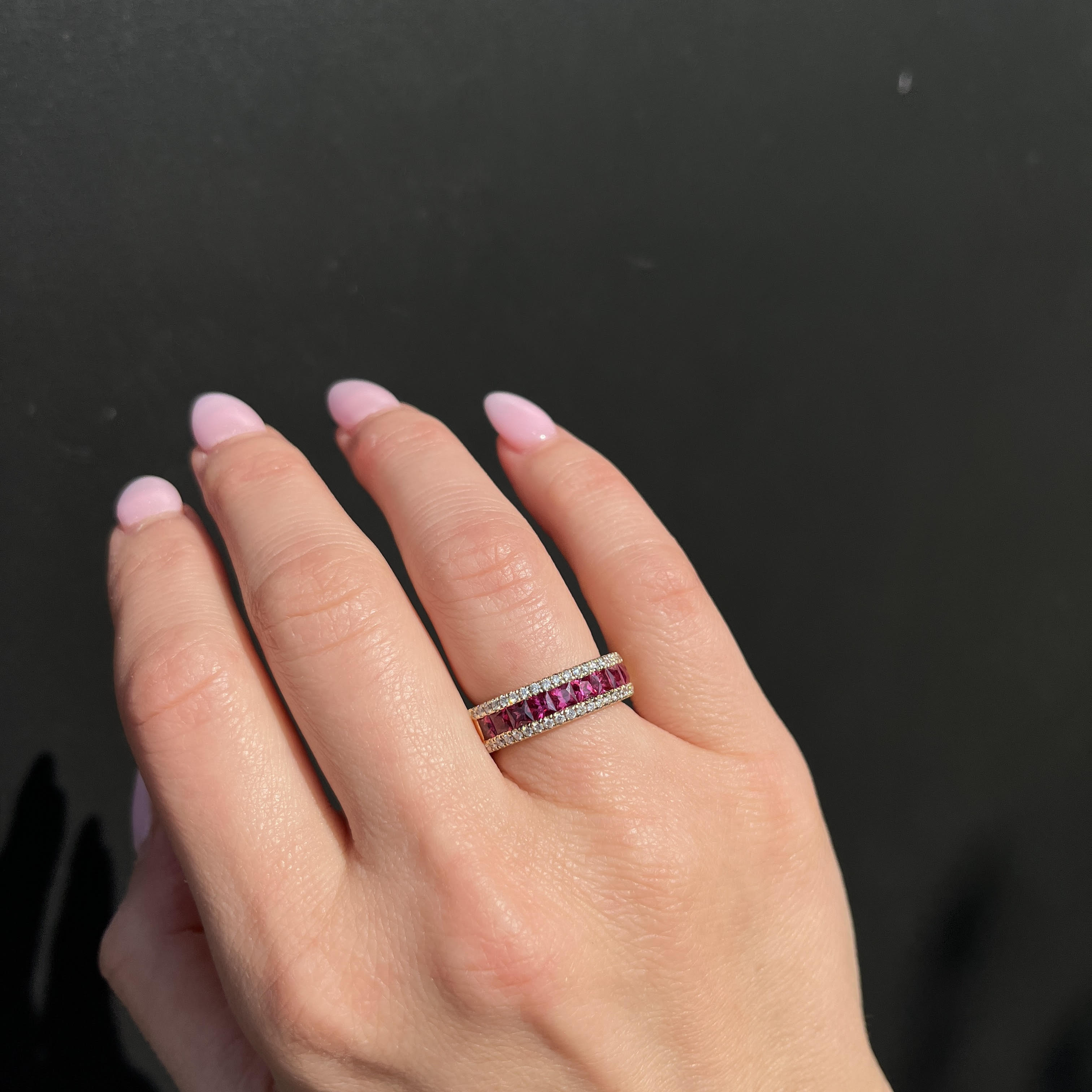 14k yellow gold, ruby, and diamond band. This elegant ring features a stunning row of ten channel-set princess-cut rubies. The rubies form a seamless ribbon of rich, vibrant color across the band, creating a bold yet refined statement. Bordering this captivating display are two rows of round brilliant cut diamonds. The ring beautifully balances the richness of rubies with the timeless elegance of diamonds, making it a striking and sophisticated piece.