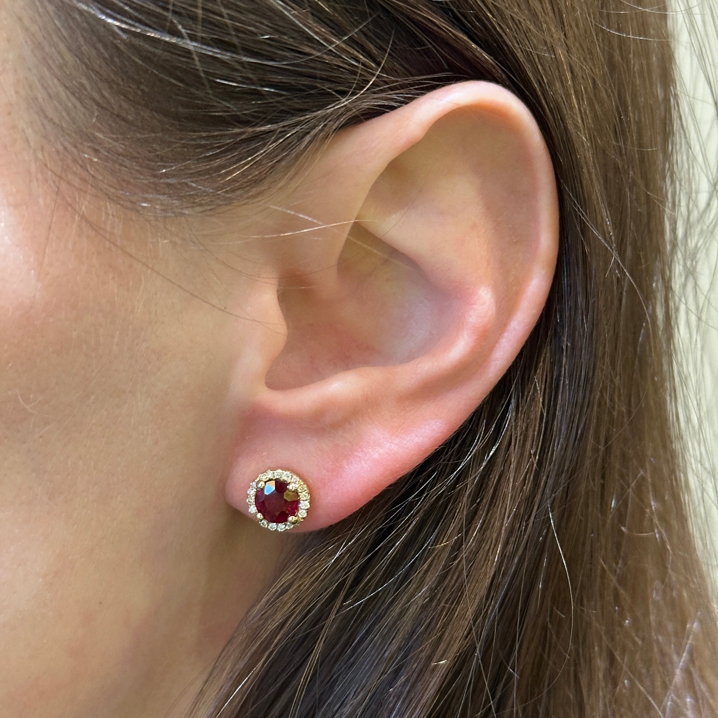 14k yellow gold, ruby, and diamond earrings. These elegant 14k yellow gold stud earrings showcase vibrant round rubies as their centerpiece. Each ruby is prong-set and surrounded by a shimmering halo of round brilliant cut diamonds. The warm yellow gold enhances the rich red hues of the rubies, while the friction back closures ensure a secure and comfortable fit.