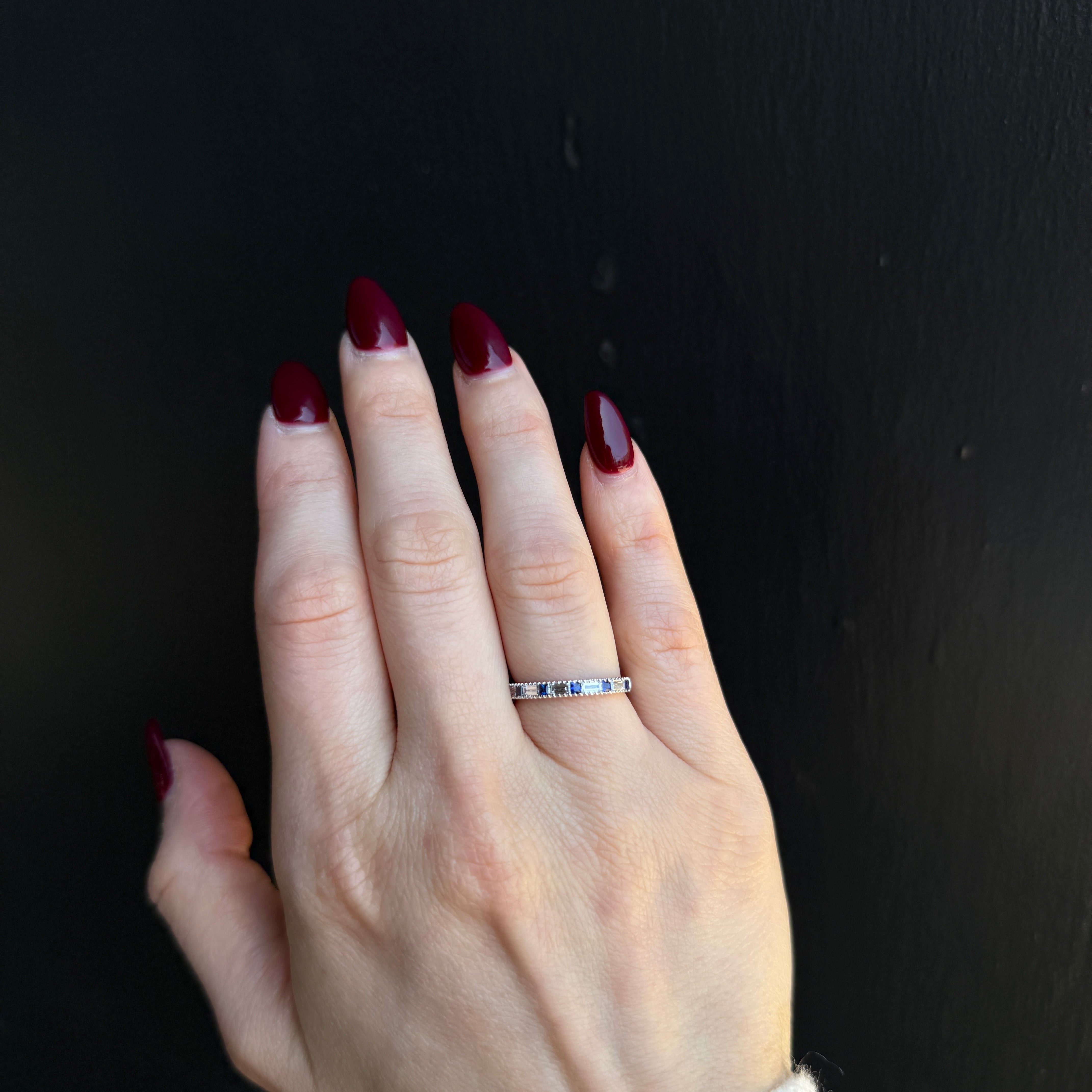 18K white gold, diamond, and sapphire band. This elegant band features a refined alternating pattern of horizontally set baguette cut diamonds and richly hued French cut blue sapphires. The gemstones are channel set, creating a sleek and continuous flow of brilliance and color halfway around the band. Delicate milgrain detailing borders the edges, adding vintage-inspired texture to the clean, modern silhouette.