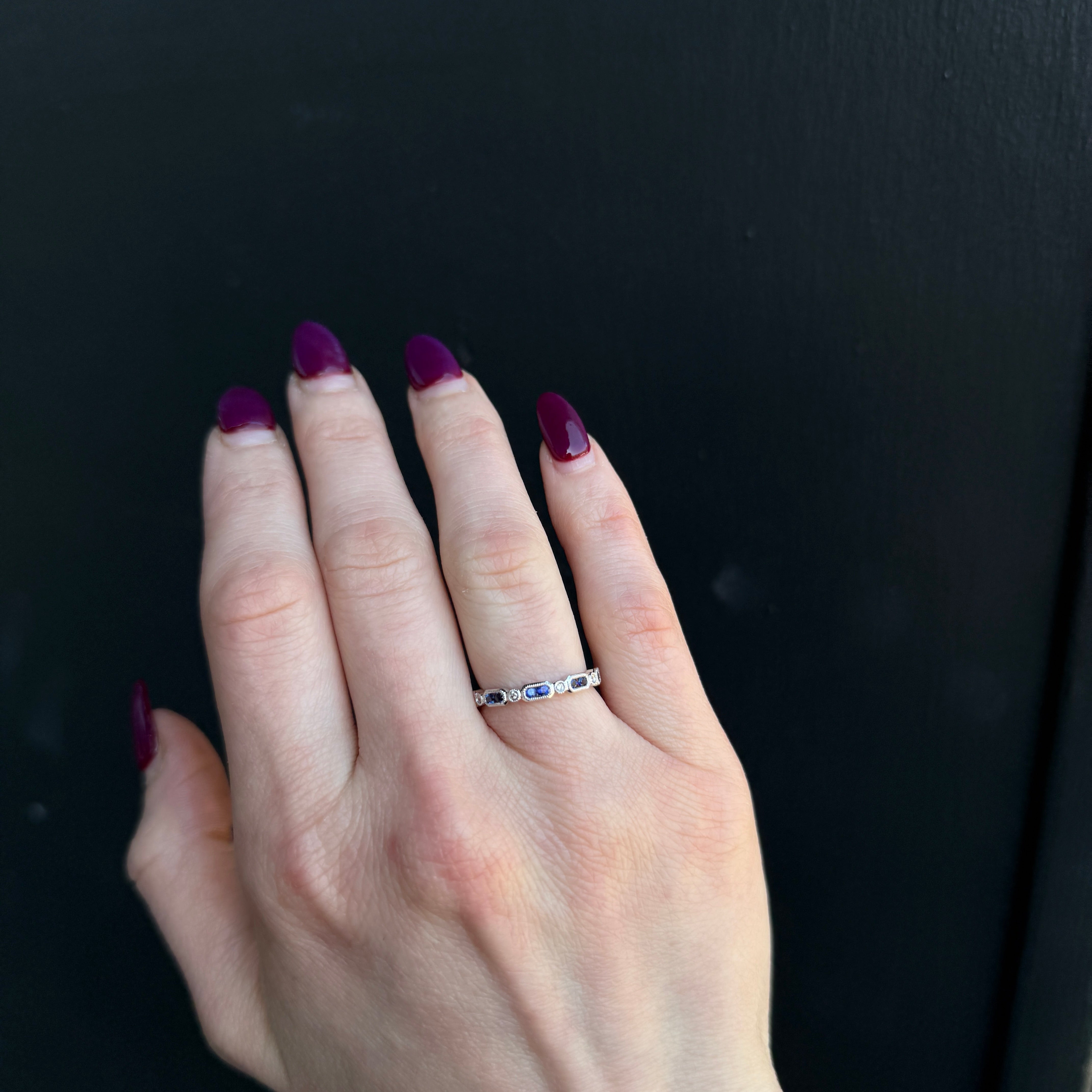 18K white gold, sapphire, and diamond band. Crafted in 18k white gold, this elegant anniversary band features a refined pattern of gemstones set across the top half of the ring. Two richly colored blue sapphires are set in each rectangular frame and flanked by a round bezel-set diamond. Perfect worn alone or stacked.