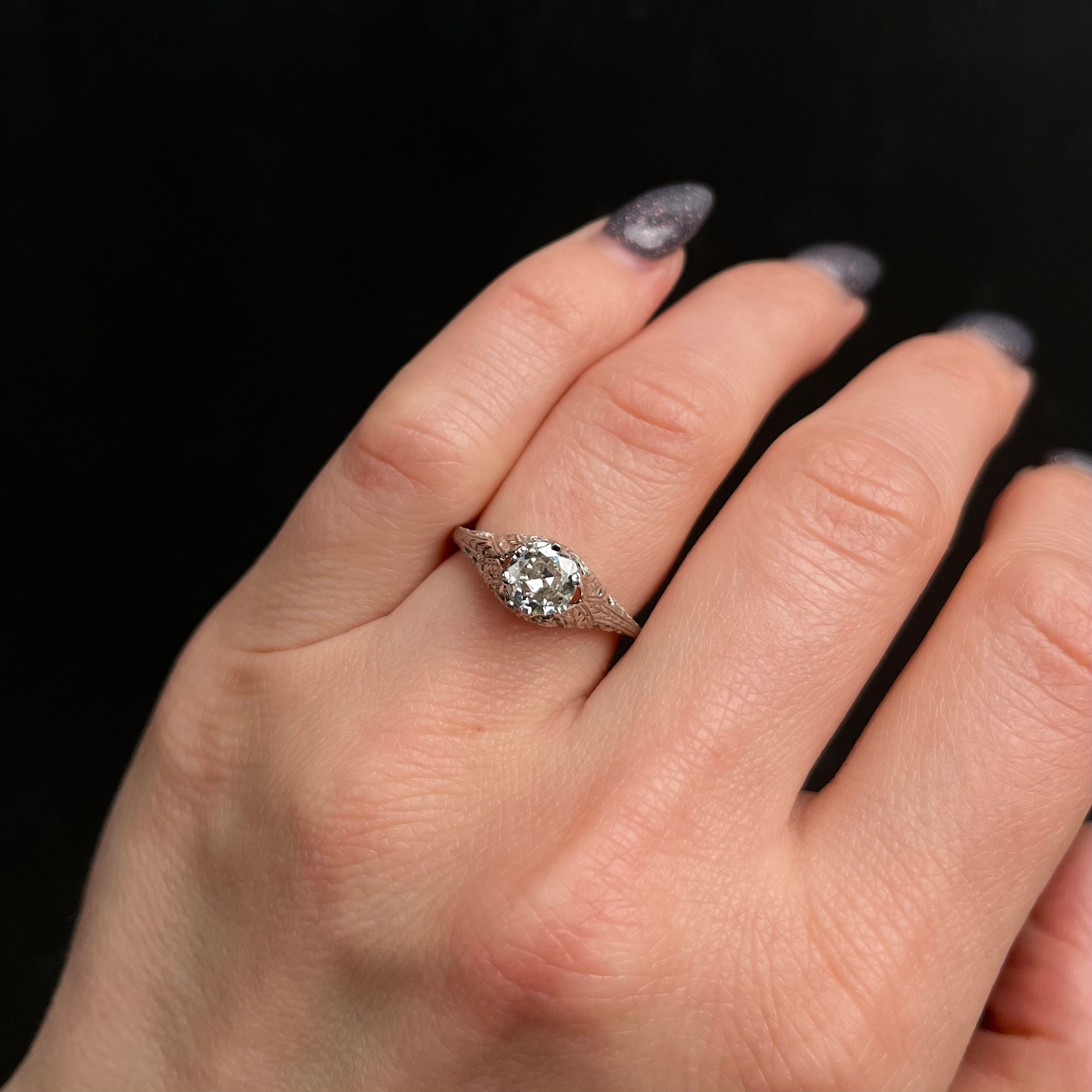 Art Deco 18k white gold and diamond ring. A breathtaking Old European cut diamond rests at the center of this stunning Art Deco diamond ring. The diamond is prong-set atop a beautiful and intricate filigree mounting. Crafted with the utmost attention to detail, this exquisite ring captures the spirit of era, complete with fabulous hand-engraved detail.