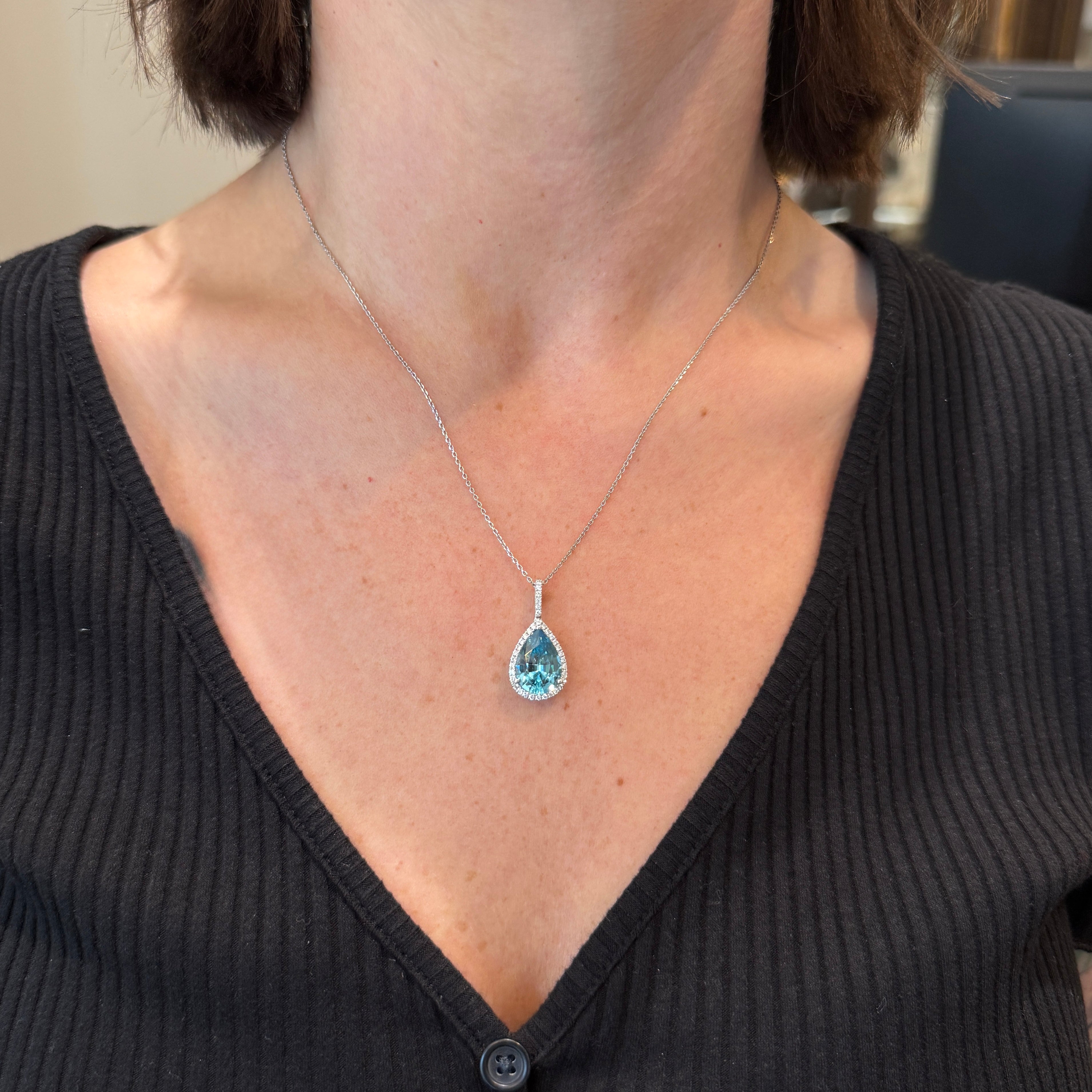 14K white gold, zircon, and diamond pendant. A breathtaking pear cut blue zircon dazzles at the center of this elegant drop pendant, radiating vivid cerulean blue brilliance. The gemstone is framed in a shimmering halo of round brilliant cut diamonds, suspended from a diamond-set bail. The pendant glows with movement and light—an effortlessly elegant design that brings a bold pop of color to any fine jewelry collection. Chain sold separately.