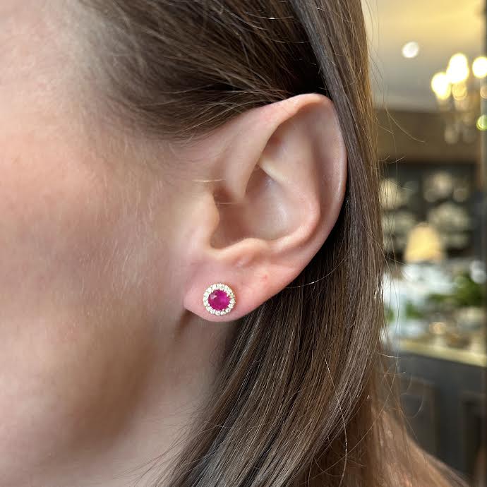14k yellow gold, ruby, and diamond earrings. These exquisite halo-style earrings feature a mesmerizing duo of rubies meticulously chosen for their captivating hues and glowing beauty. Set in gleaming 14k yellow gold, each gemstone is surrounded by a dazzling halo of round brilliant cut diamonds that add an extra layer of brilliance. The earrings feature a post and friction style back closure.