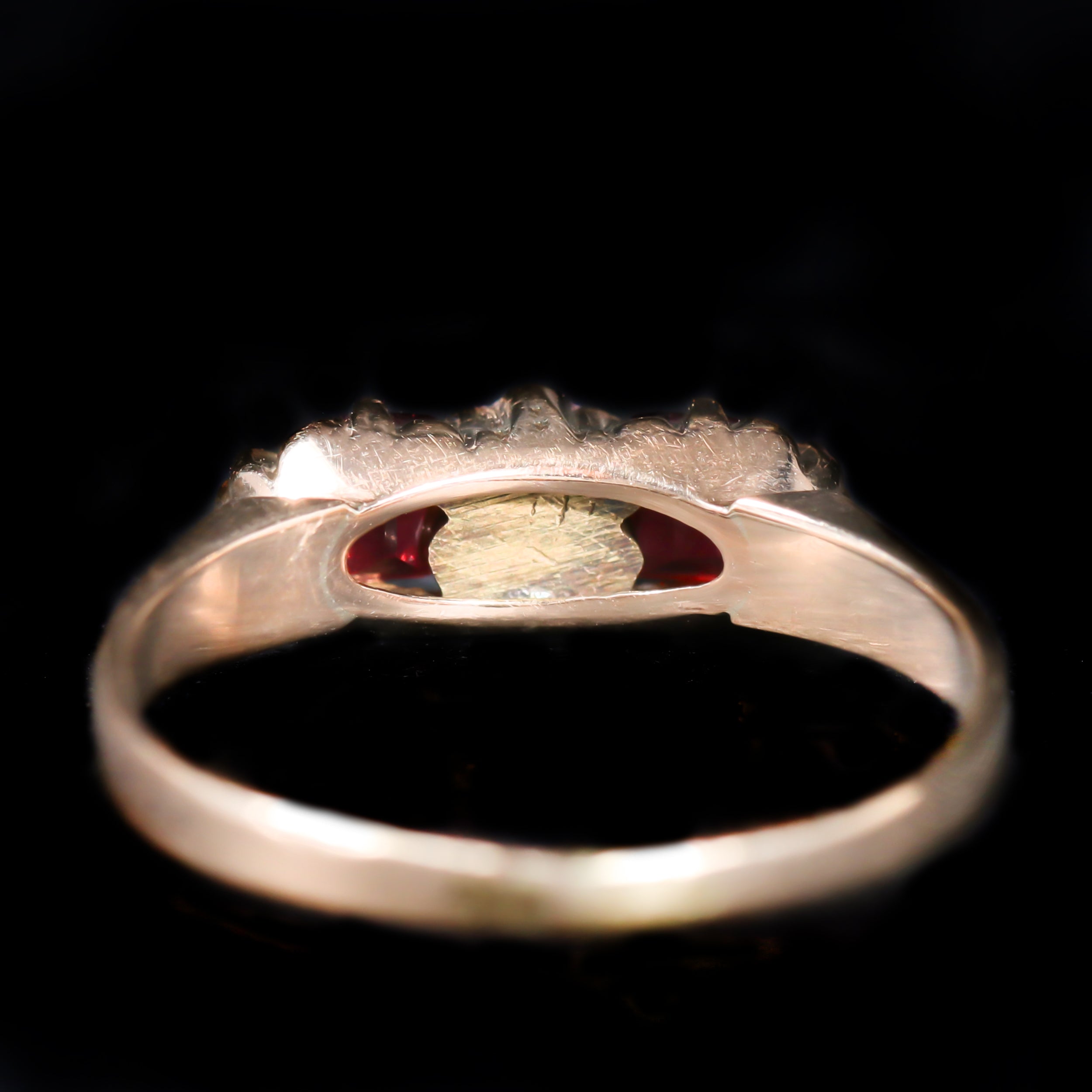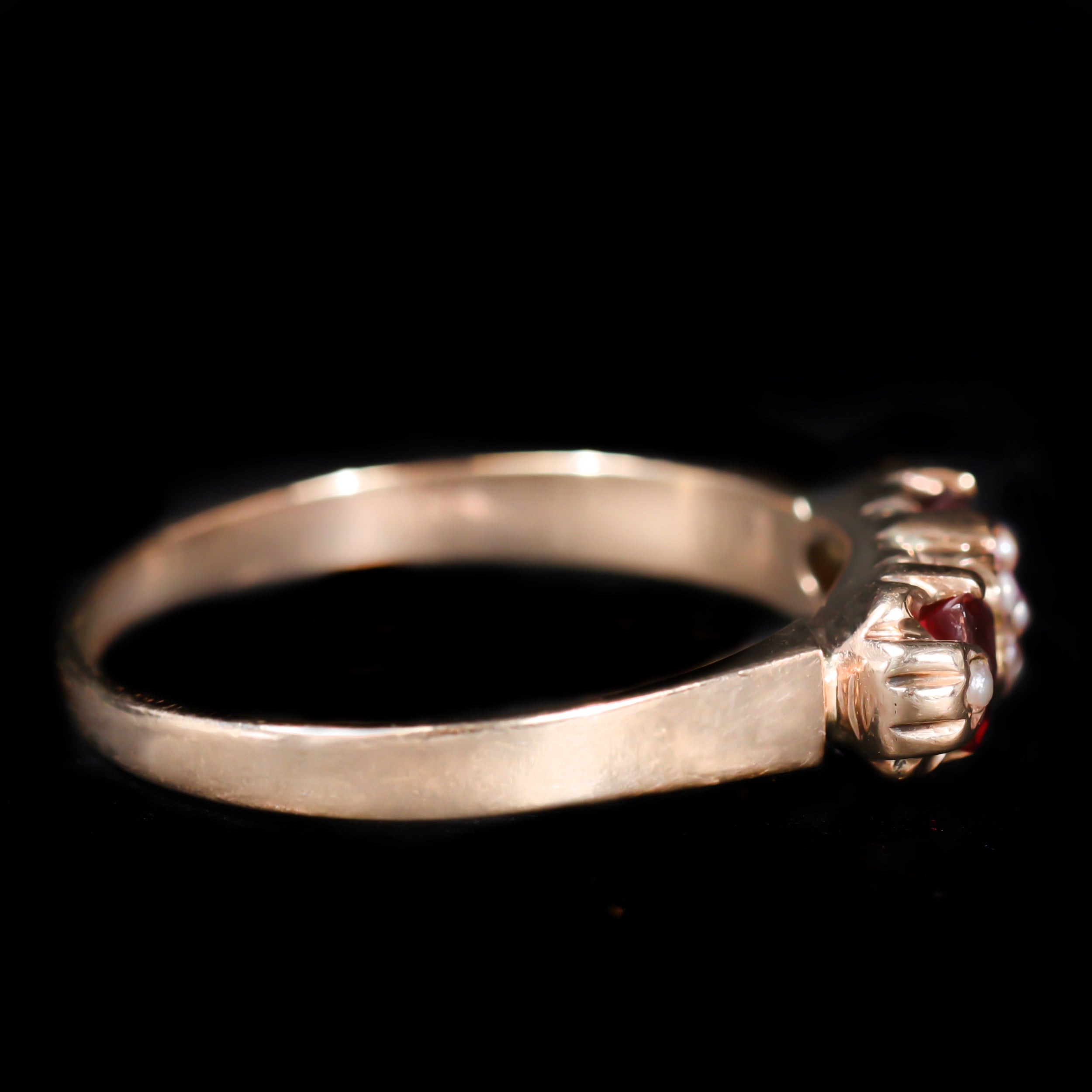 Victorian 14K yellow gold, pearl, and garnet glass doublet ring. A delicate floral cluster of seed pearls forms a soft focal point. Flanking the cluster are two garnet glass doublets, their rich red tones adding warmth and color, while an additional seed pearl on each end completes the design. Simple yet thoughtfully composed, this ring captures the understated elegance and romantic spirit of the late 19th century.
