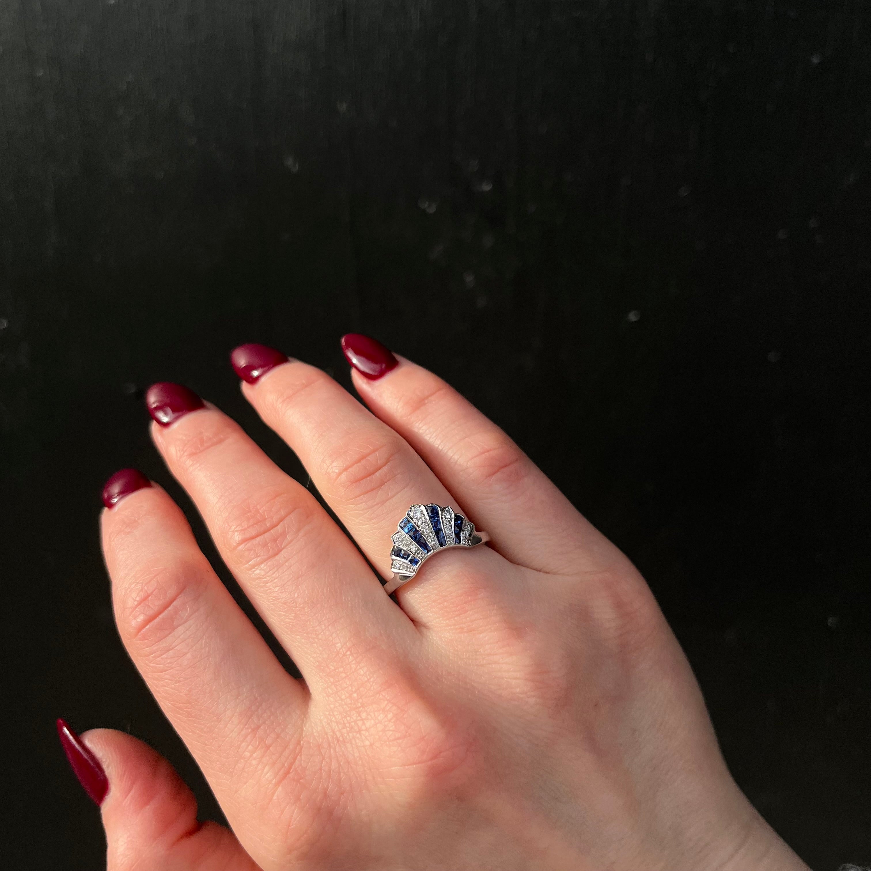 14K white gold, diamond, and sapphire band. This stunning tiara ring takes its cues from the 1920s with its attention to detail and fan-shaped design. Vivid blue sapphires are nestled in a channel setting between ribbons of dazzling round brilliant cut diamonds, all finished with fine milgrain edges.