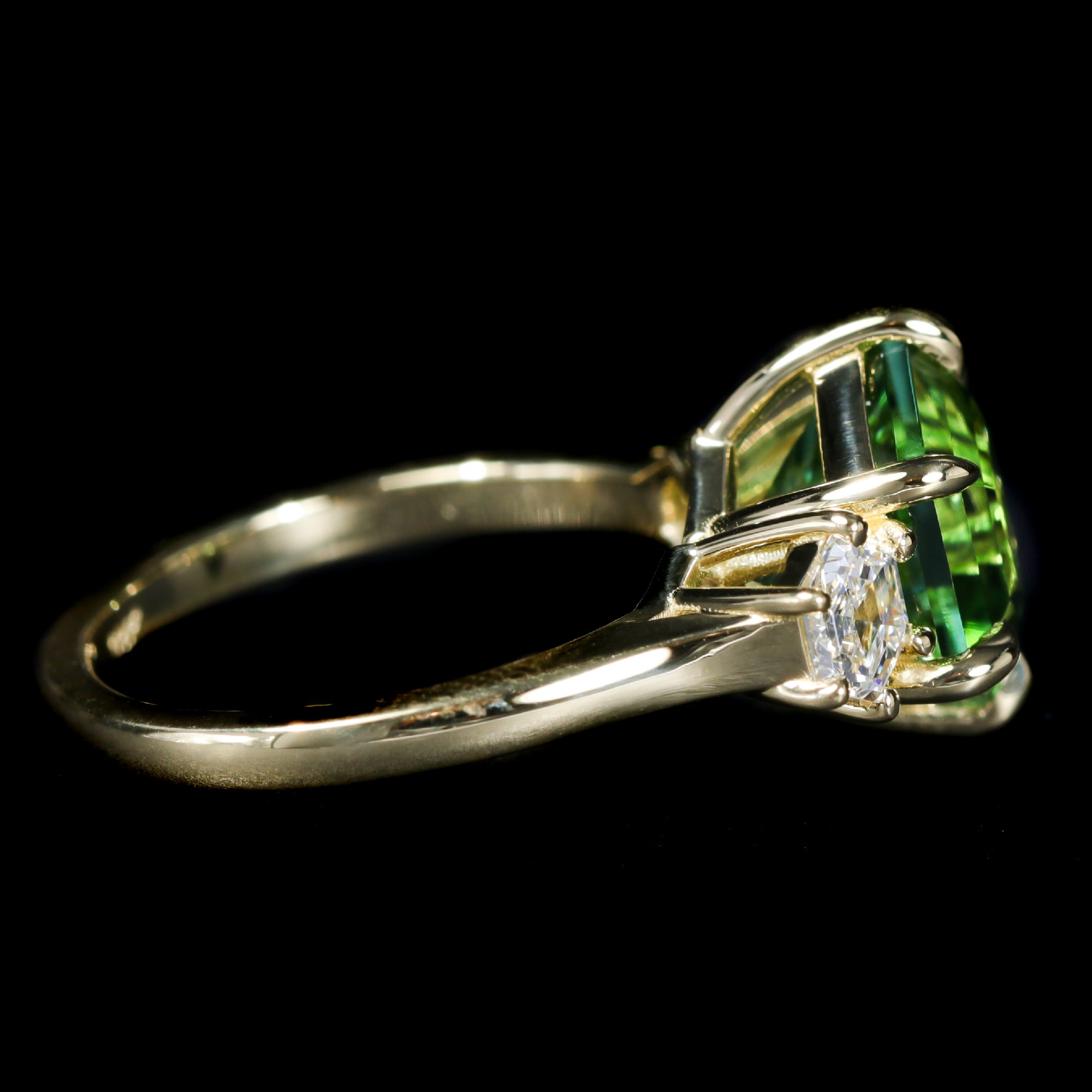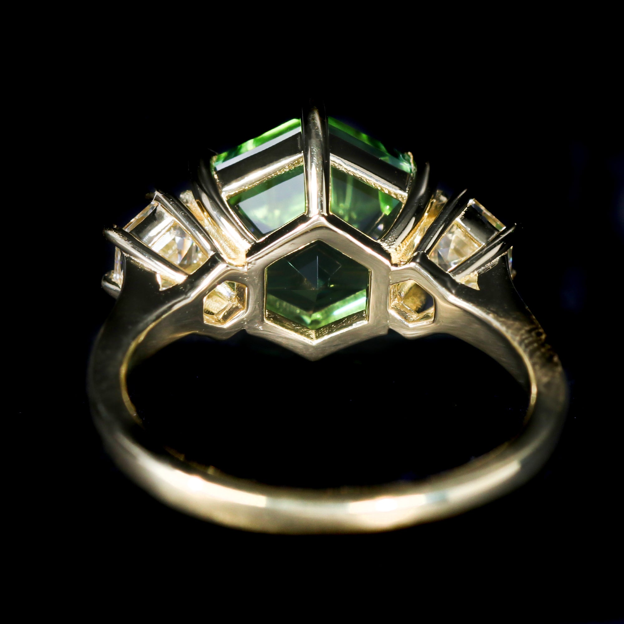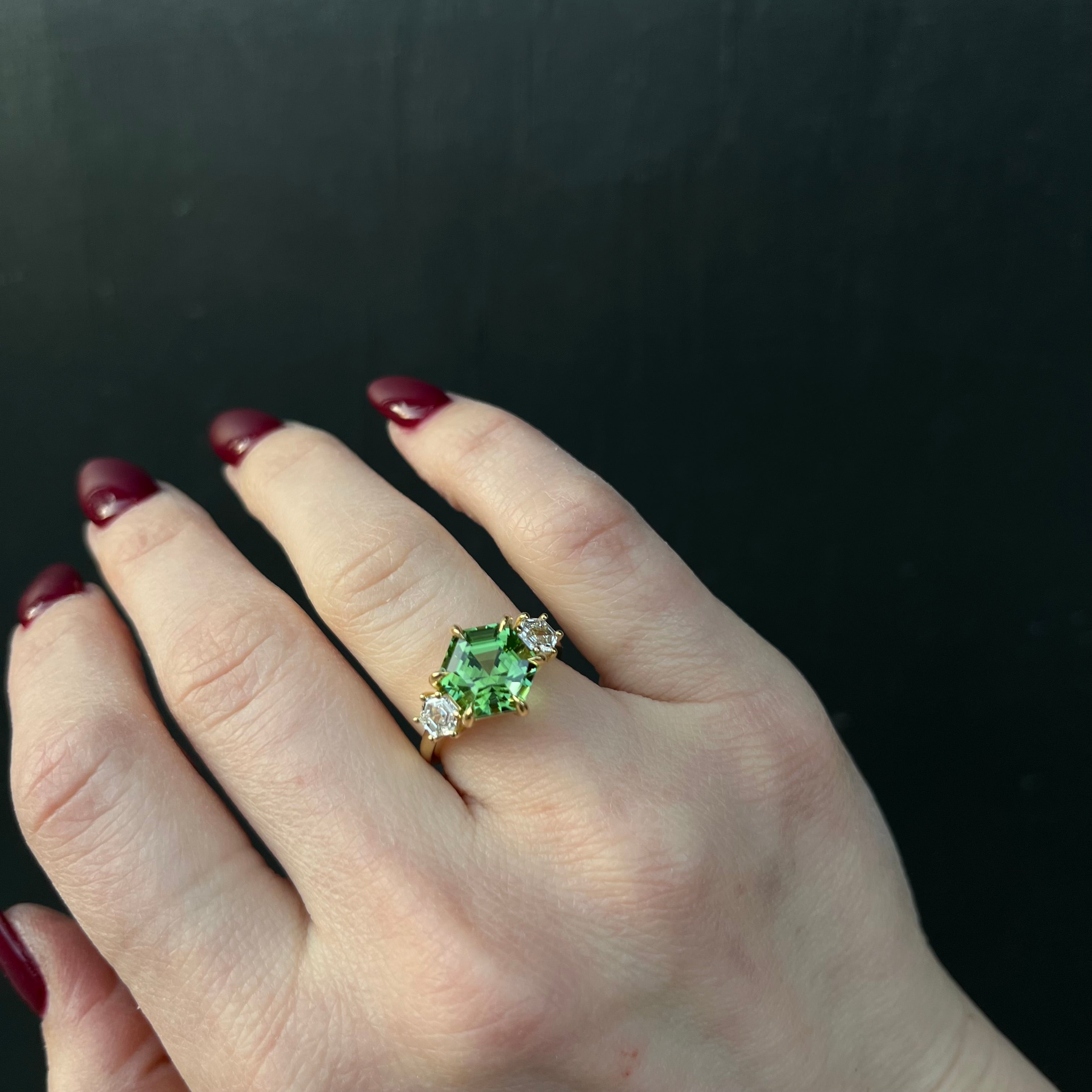 18k yellow gold tourmaline and diamond ring. A resplendent hexagon-cut tourmaline,imbued with gorgeous green hues, is prong-set at the center of this beautiful gemstone ring. Its distinctive shape and color are accentuated by two hexagon-cut diamonds, adding a touch of sparkle to the design, and ensuring that the ring catches the eye and captivates with its brilliance.