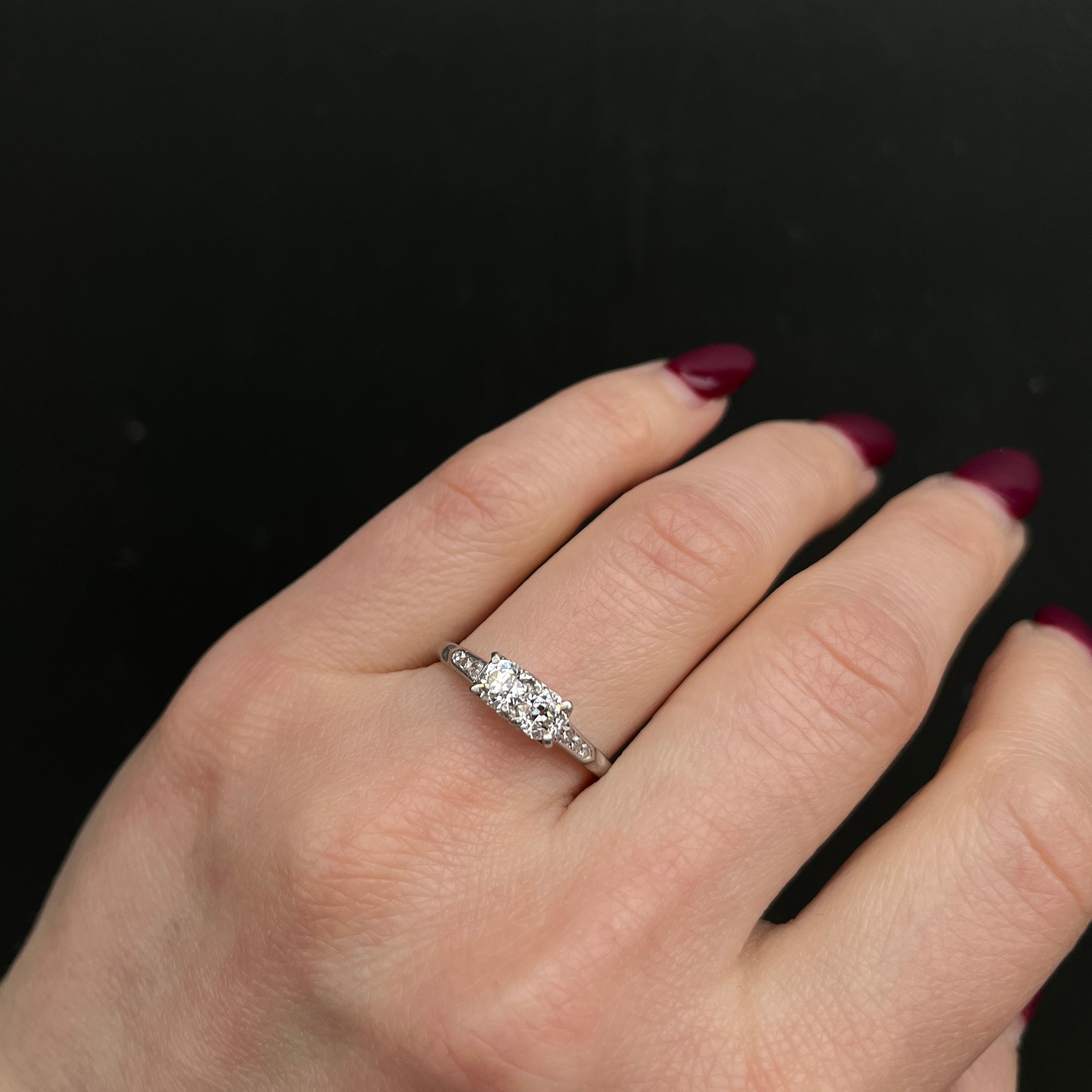 • Center Gem Details: 2 Old Mine Cut Diamonds (approx. 0.70 carats total weight, VS1 clarity, G/H color)