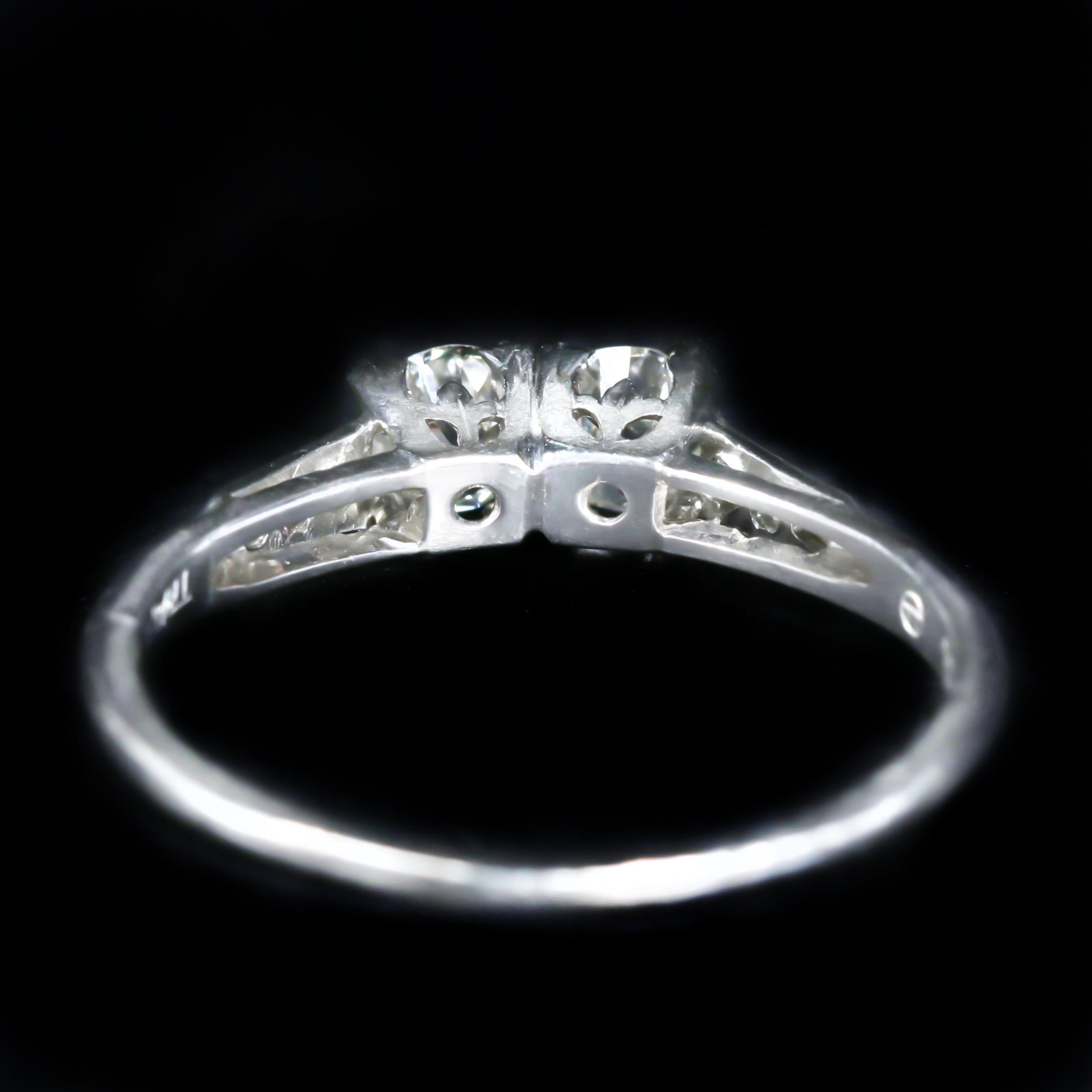 Art Deco Traub Orange Blossom platinum and diamond ring. Two center Old Mine cut diamonds crown this dazzling Art Deco toi et moi style design. Flanking the central diamonds are three single cut diamonds on each shoulder, crafted in lustrous platinum and boasting the exceptional quality and craftsmanship synonymous with the Traub Orange Blossom line. Stamped with Traub's maker's mark, and "ORANGE BLOSSOM".