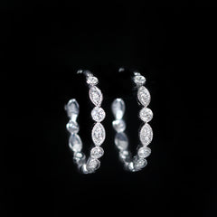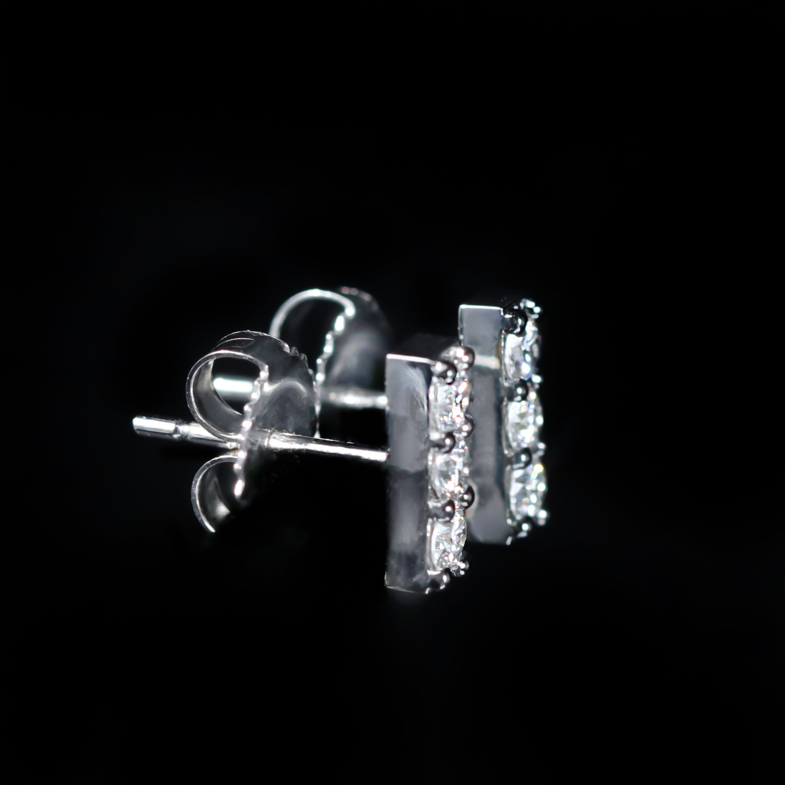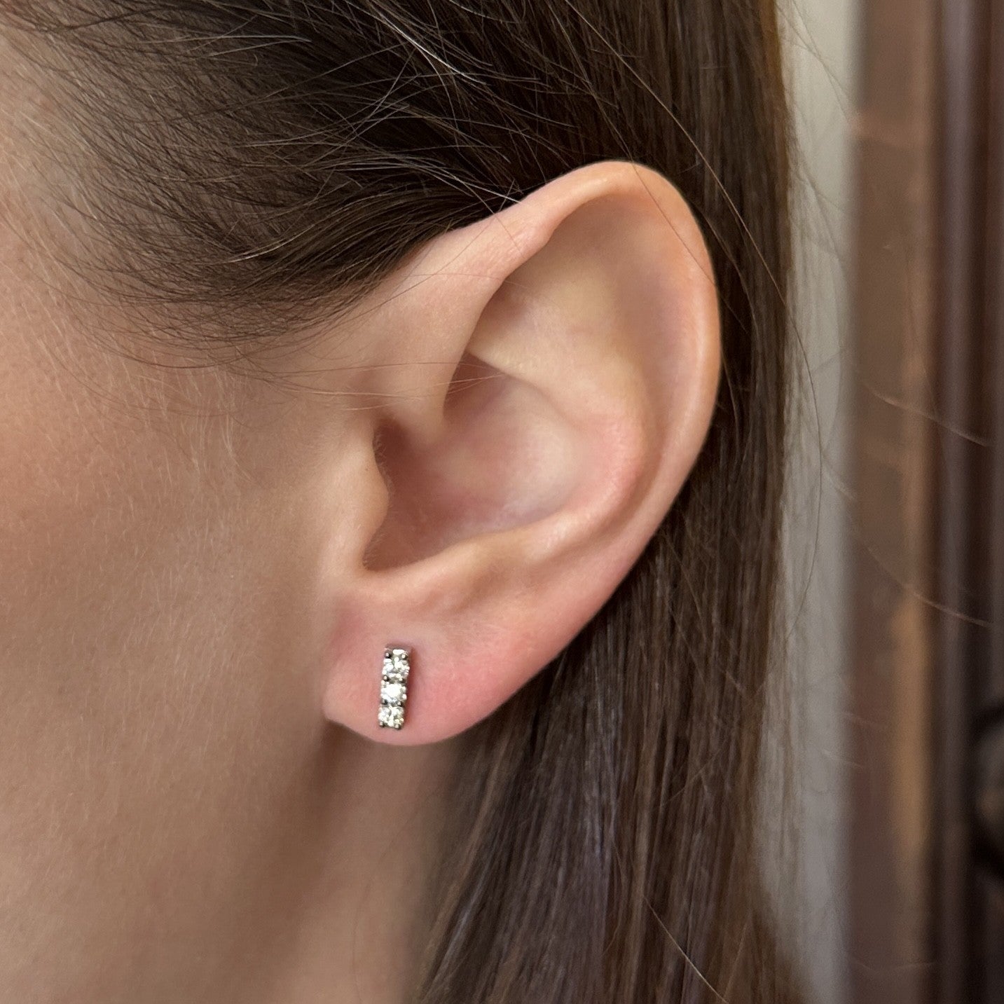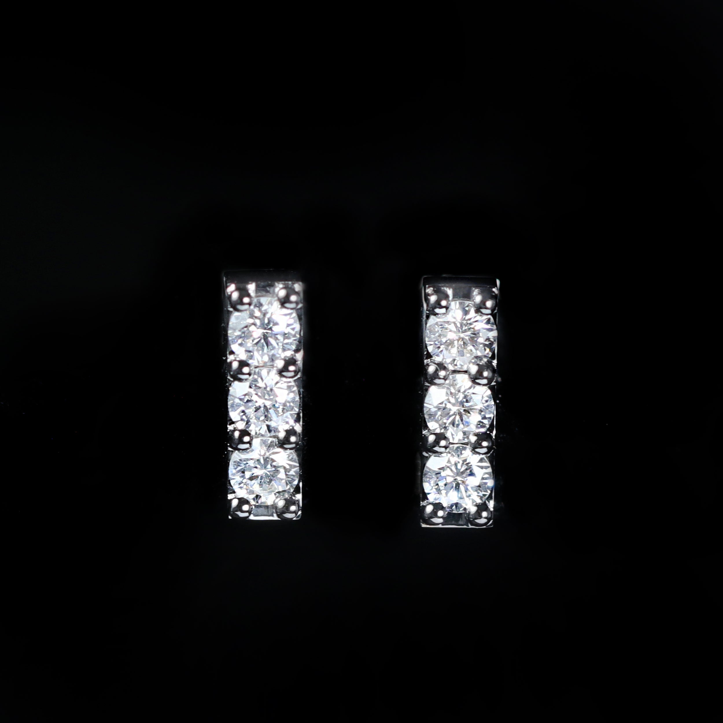 14K white gold and diamond earrings. These diamond earrings strike the perfect balance between subtle sparkle and modern edge. Crafted in 14K white gold, each earring features a vertical row of round brilliant cut diamonds totaling 0.34 carats, secured with black rhodium prongs that add depth and a slightly unexpected, contemporary contrast. Petite and polished, they’re ideal for a second piercing or for layering with studs or hoops, bringing a hint of brilliance to your everyday ear stack while remaining timeless and easy to wear.