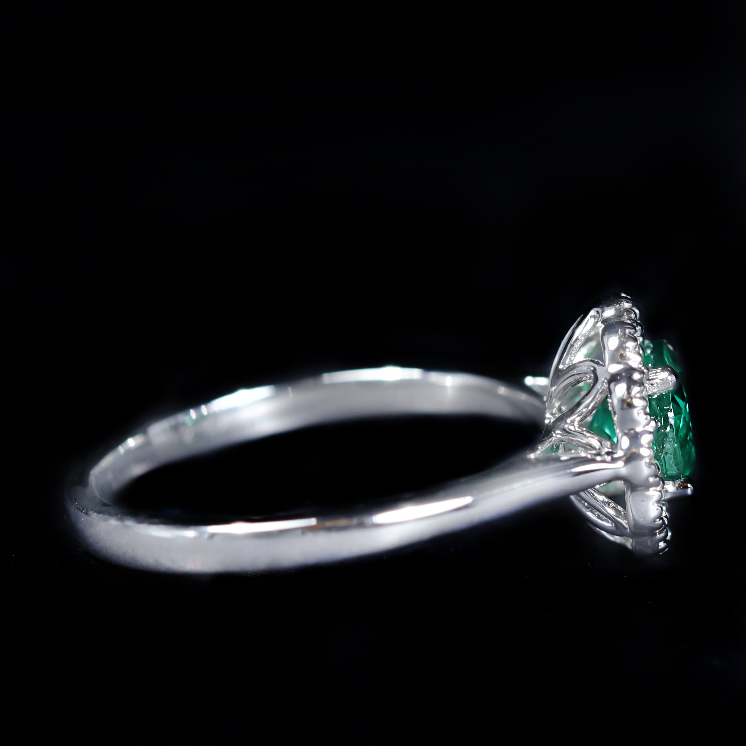 14K white gold, emerald, and diamond ring. A vivid round cut emerald, weighing approximately 0.78 carats, anchors this 14K white gold ring with a fresh, luminous green glow. The emerald is secured in four prongs and encircled by a halo of round brilliant cut diamonds, each framed by delicate milgrain edging that adds texture and vintage-inspired refinement. Graceful and beautifully balanced, this ring highlights the timeless allure of emeralds paired with classic diamond sparkle.