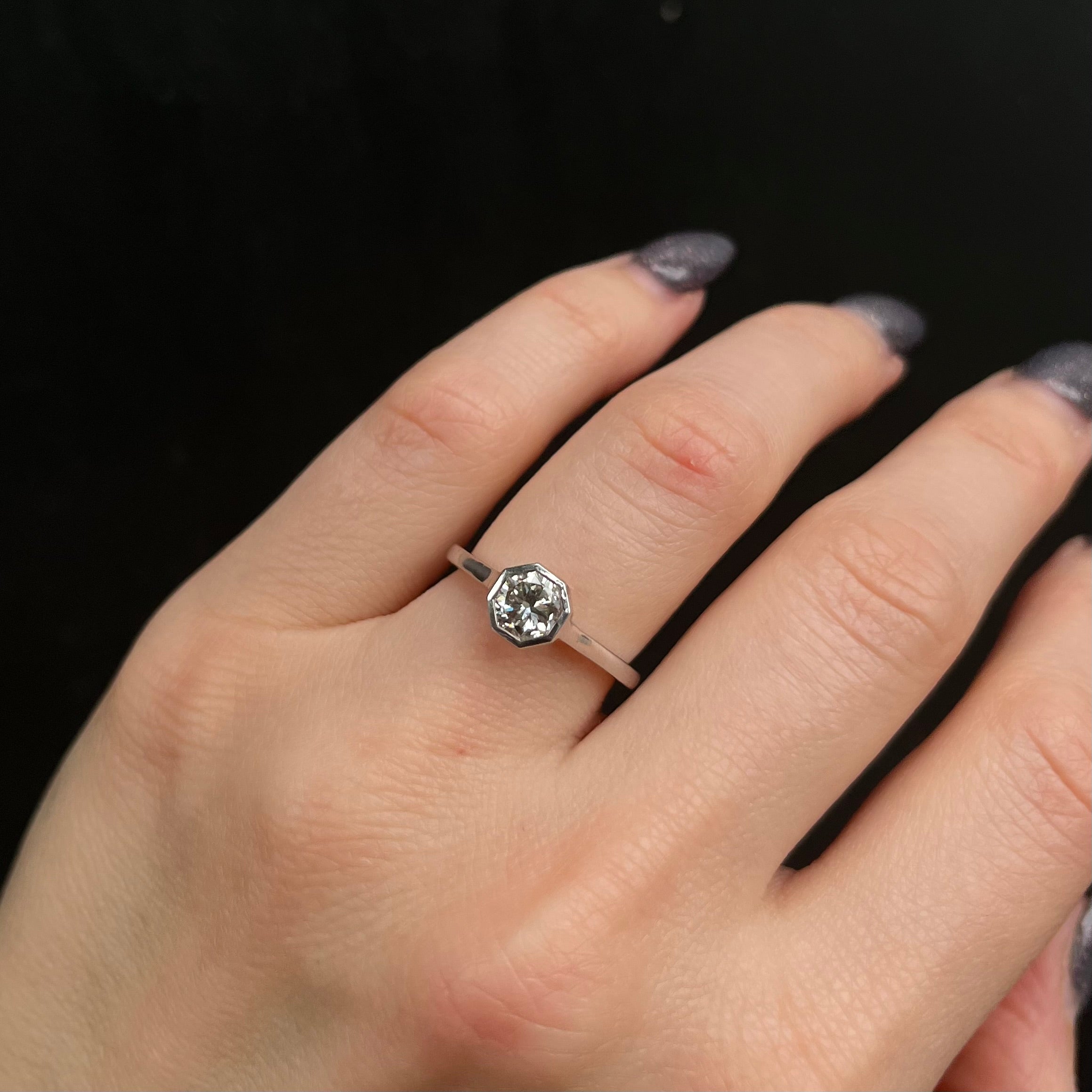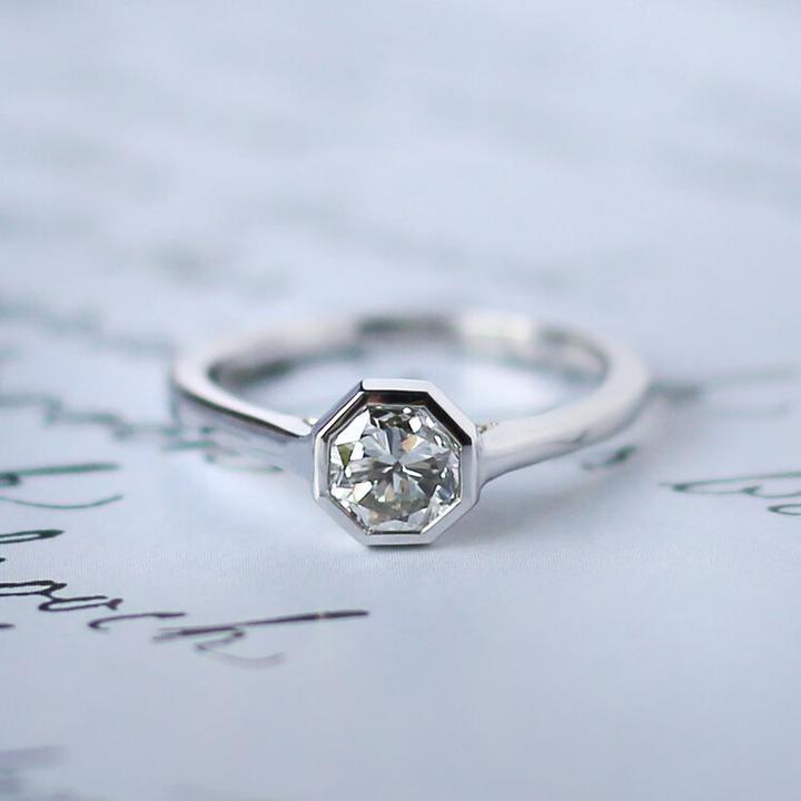 14K white gold and diamond ring. This simple yet elegant engagement ring features a bezel-set octagon cut diamond in bright white gold. The octagon shape offers a unique and unexpected design, perfect for the bride looking for something truly different!