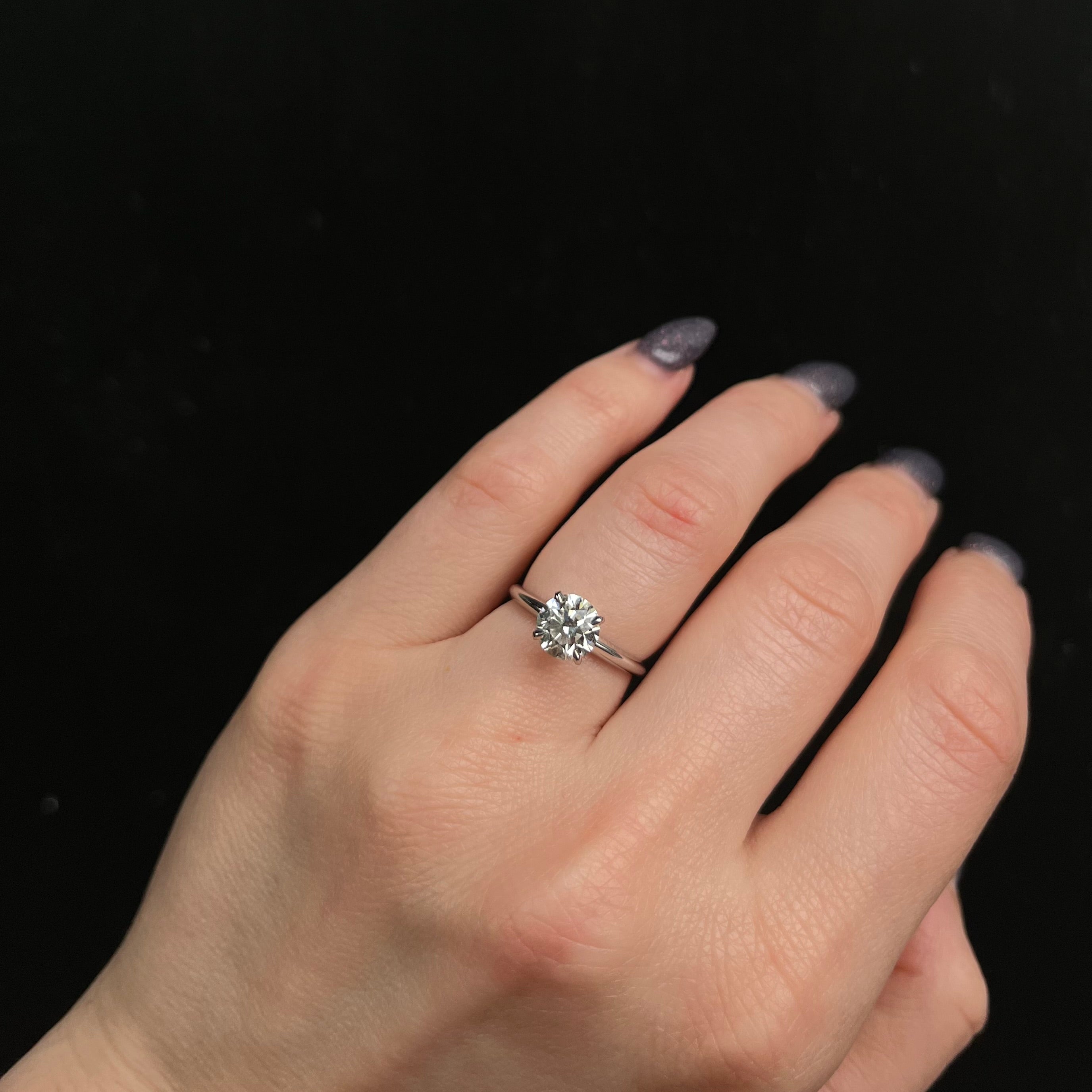 14K white gold and diamond ring. Classic and sophisticated, this scintillating 1.30 carat Round Brilliant cut diamond sparkles beautifully with every turn. The diamond is accompanied by a GIA Diamond Report and rests in four claw-style prongs. Crafted in gleaming white gold, this ring has a timeless beauty and would make a very special engagement ring.