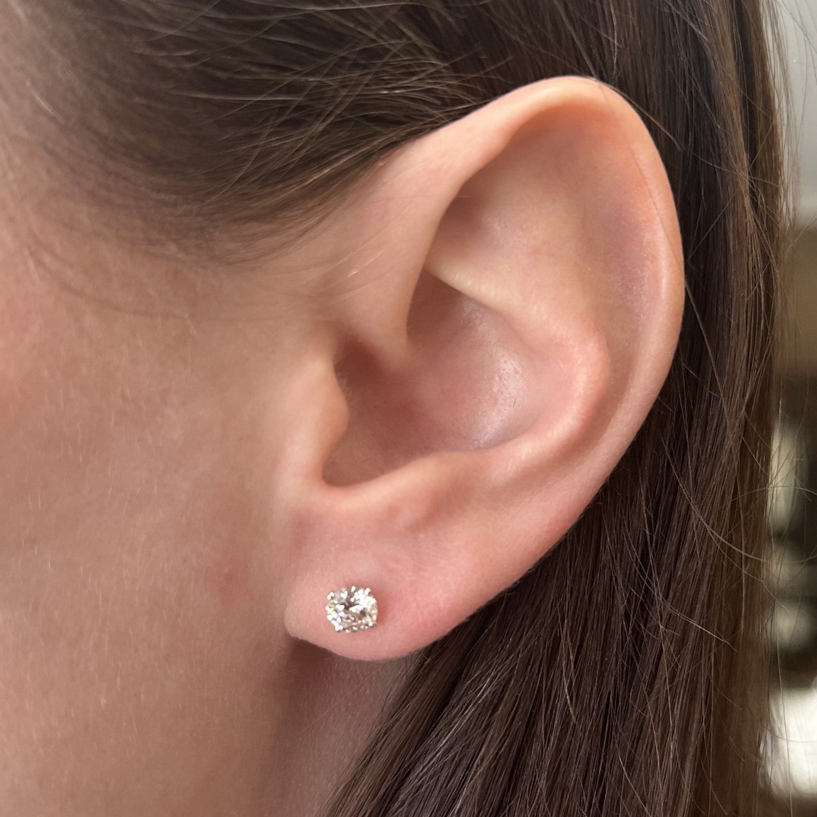 14K white gold diamond stud earrings. These timeless diamond studs are crafted in 14K white gold and feature a beautifully matched pair of round brilliant cut diamonds, each weighing 0.50 carat. Accompanied by GIA reports and cut to ideal proportions, they display exceptional brilliance and incredible sparkle. The classic martini-style mountings allow the diamonds to sit close to the ear and stay beautifully face-up, with minimal metal for a clean, elegant look. An enduring staple, these diamond studs add effortless sparkle to everything from jeans and a T-shirt to a little black dress.