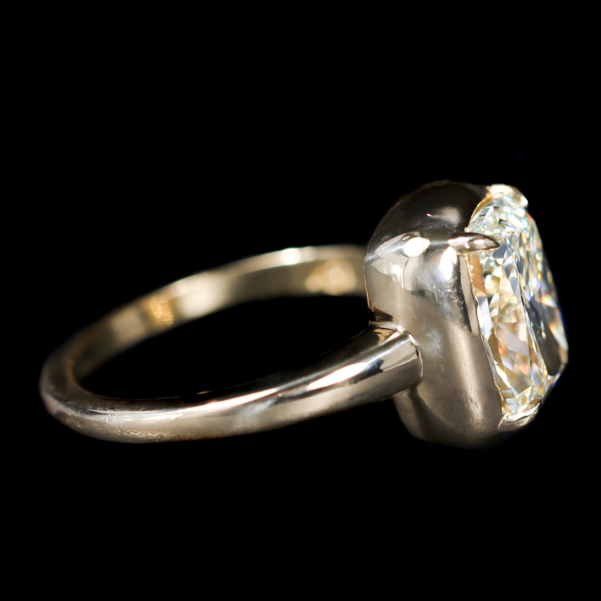 18K yellow gold and diamond ring. An elongated 3.02 carat cushion-cut diamond takes center stage in this 18K yellow gold engagement ring. Set in four prongs, the mounting follows the soft curves of the cushion shape, giving the ring a bold, sculpted presence. The warm tone of the gold complements the diamond’s gentle color, creating a look that feels substantial, confident, and timeless.