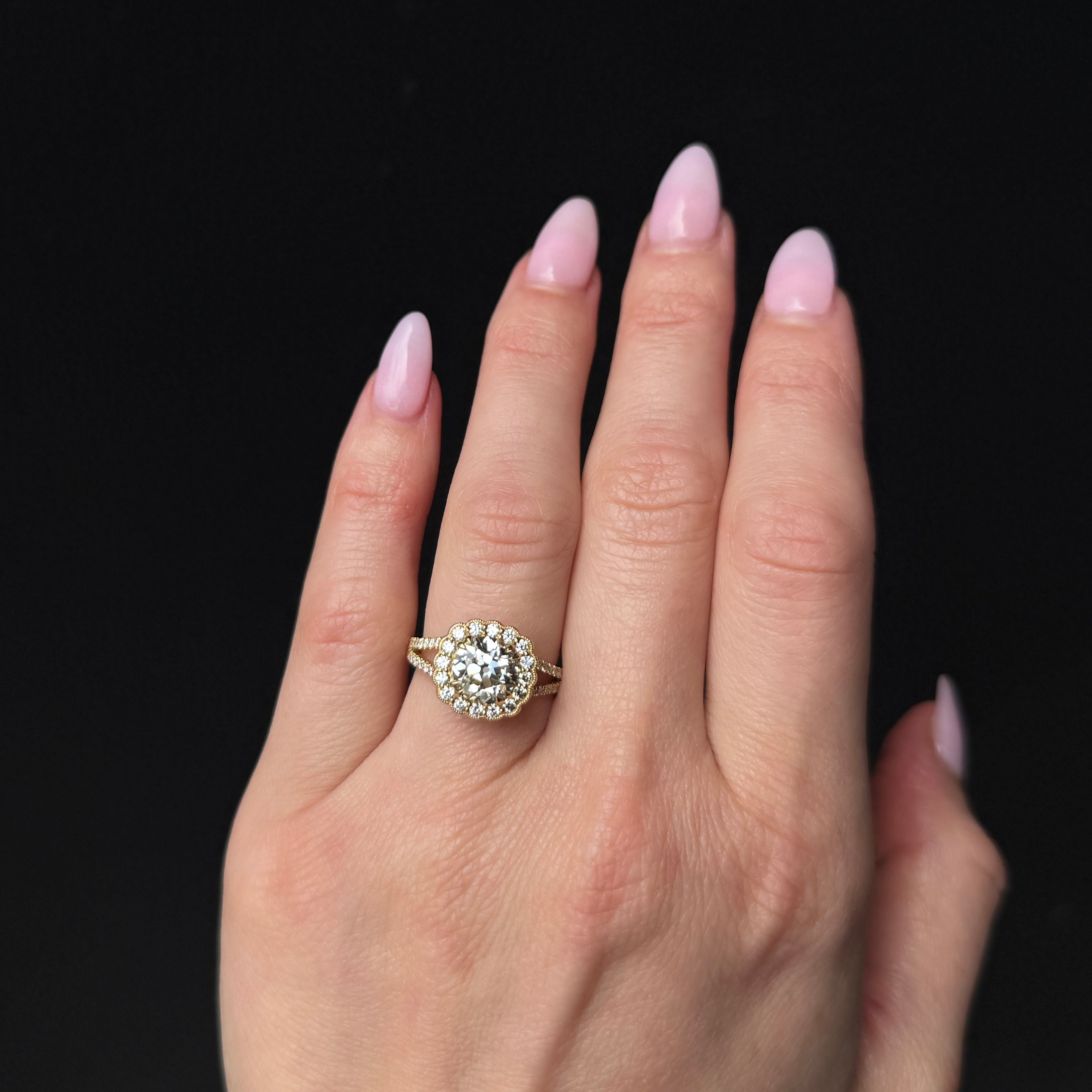 18K yellow gold and diamond ring. This 18k yellow gold ring showcases a stunning 2.00 carat Old European cut diamond at its center, set in four elegant split prongs. Surrounding the center is a scalloped halo of round brilliant cut diamonds, bordered with fine milgrain detailing. Additional diamonds line the split shank halfway down. With its blend of antique diamond charm and thoughtful design, this ring is truly timeless—an exquisite choice for a distinctive engagement or statement piece.