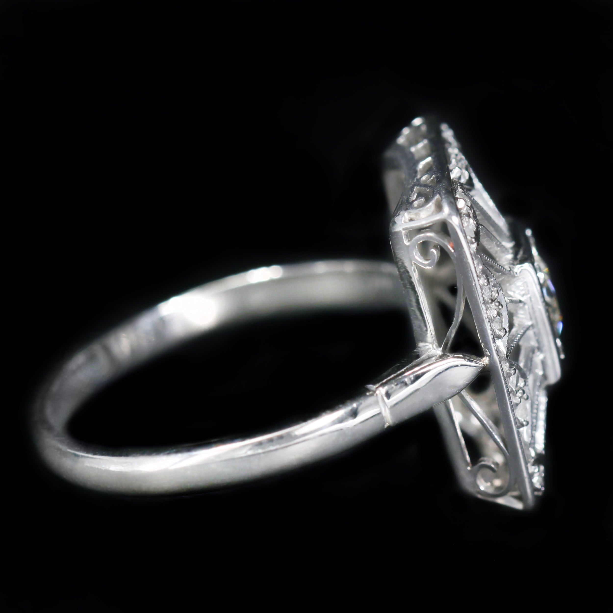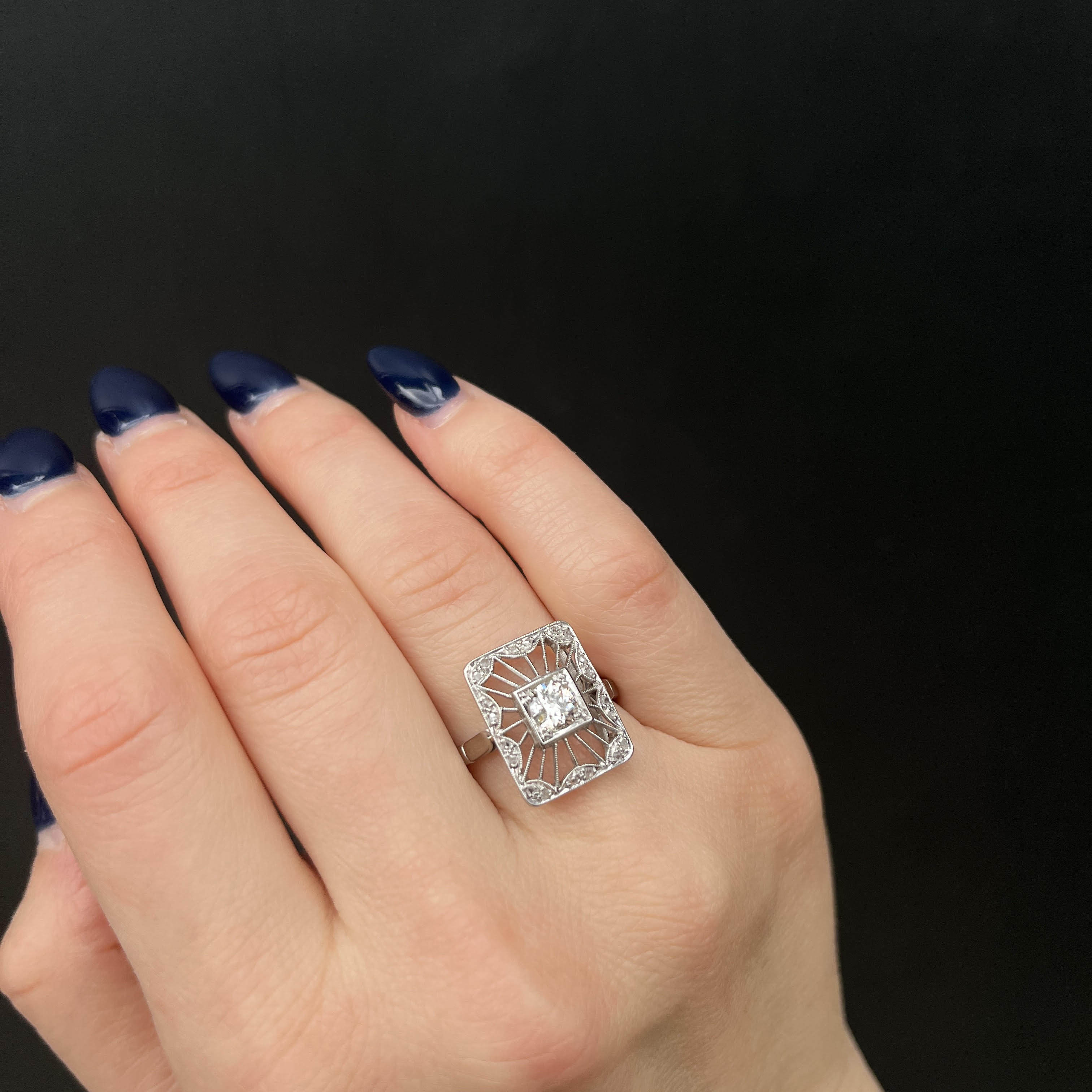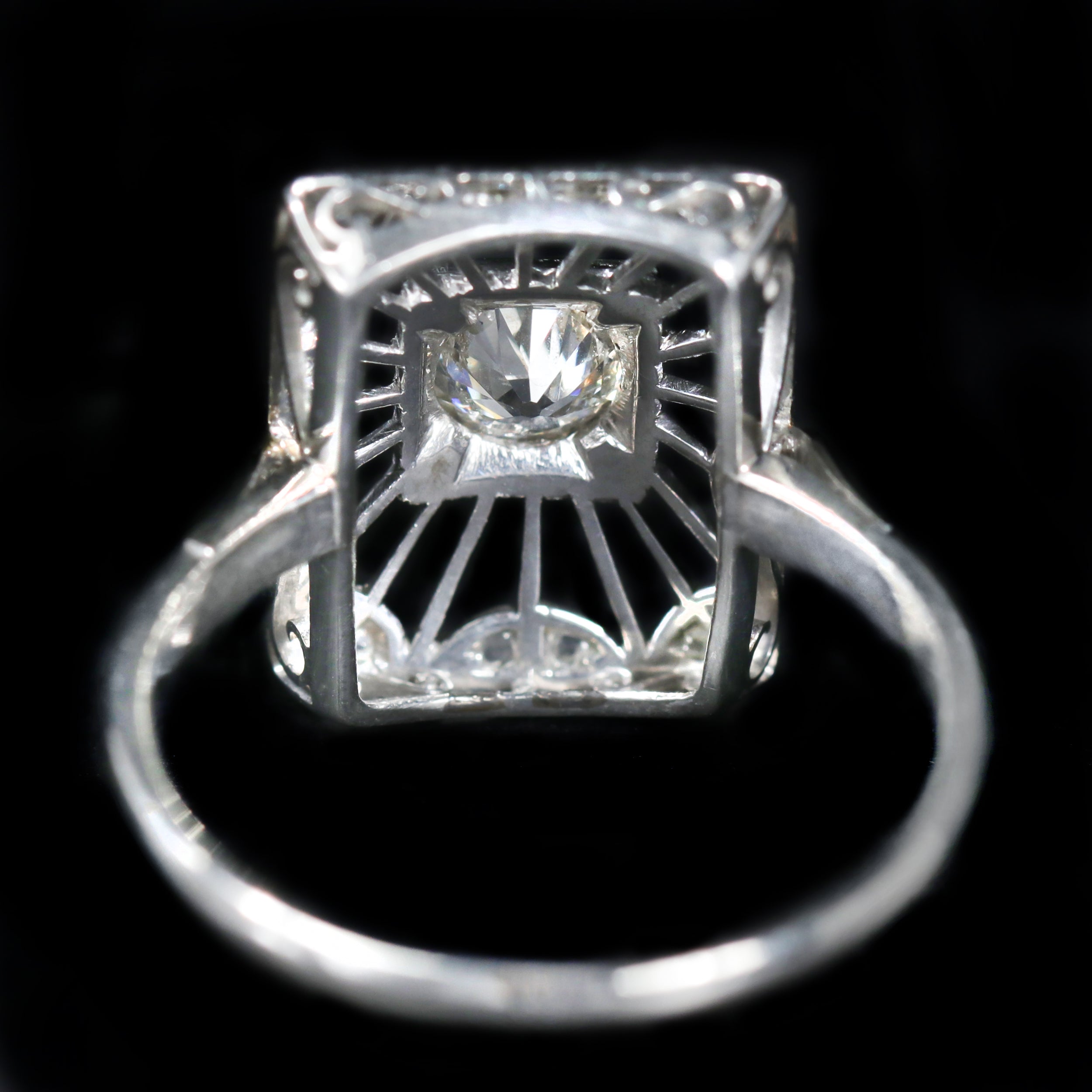 Art Deco platinum and diamond ring. This exquisite Art Deco platinum ring embodies the craftsmanship of the era with its open filigree rectangular design. At its center lies a dazzling Old European cut diamond, set in a classic square frame. Surrounding the center stone, delicate platinum rays, accented with fine milgrain detail, lead to a border of twenty rose-cut diamonds.