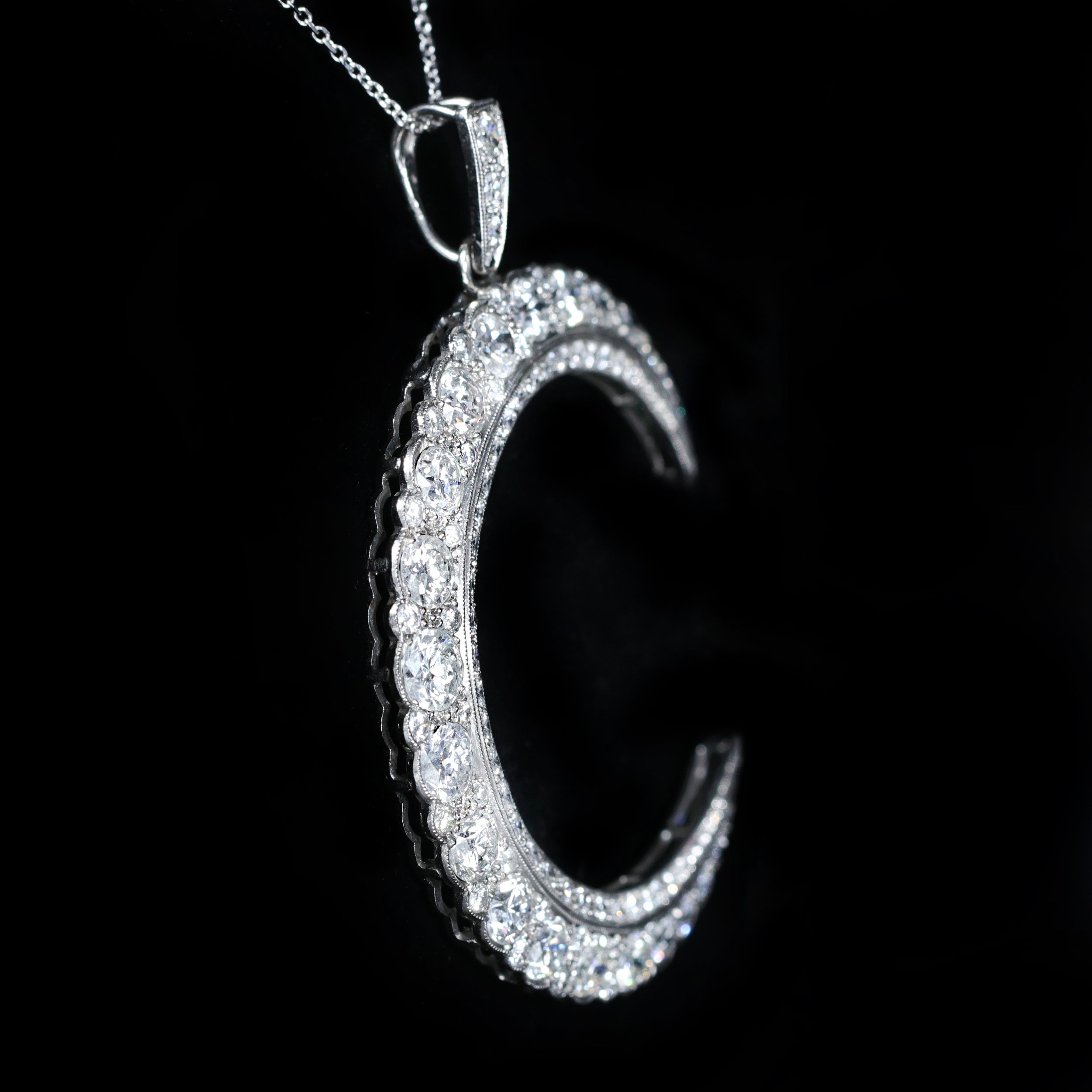 Estate platinum and diamond pendant. A dramatic crescent pendant crafted in platinum and set with dazzling diamonds creates an unforgettable play of light. Old European cut, transitional cut, and round brilliant cut diamonds are layered together, their differing facets giving the surface movement and character. Measuring approximately 1.75 inches at its widest point and 2.25 inches in length including the bale, the scale feels bold yet elegant.