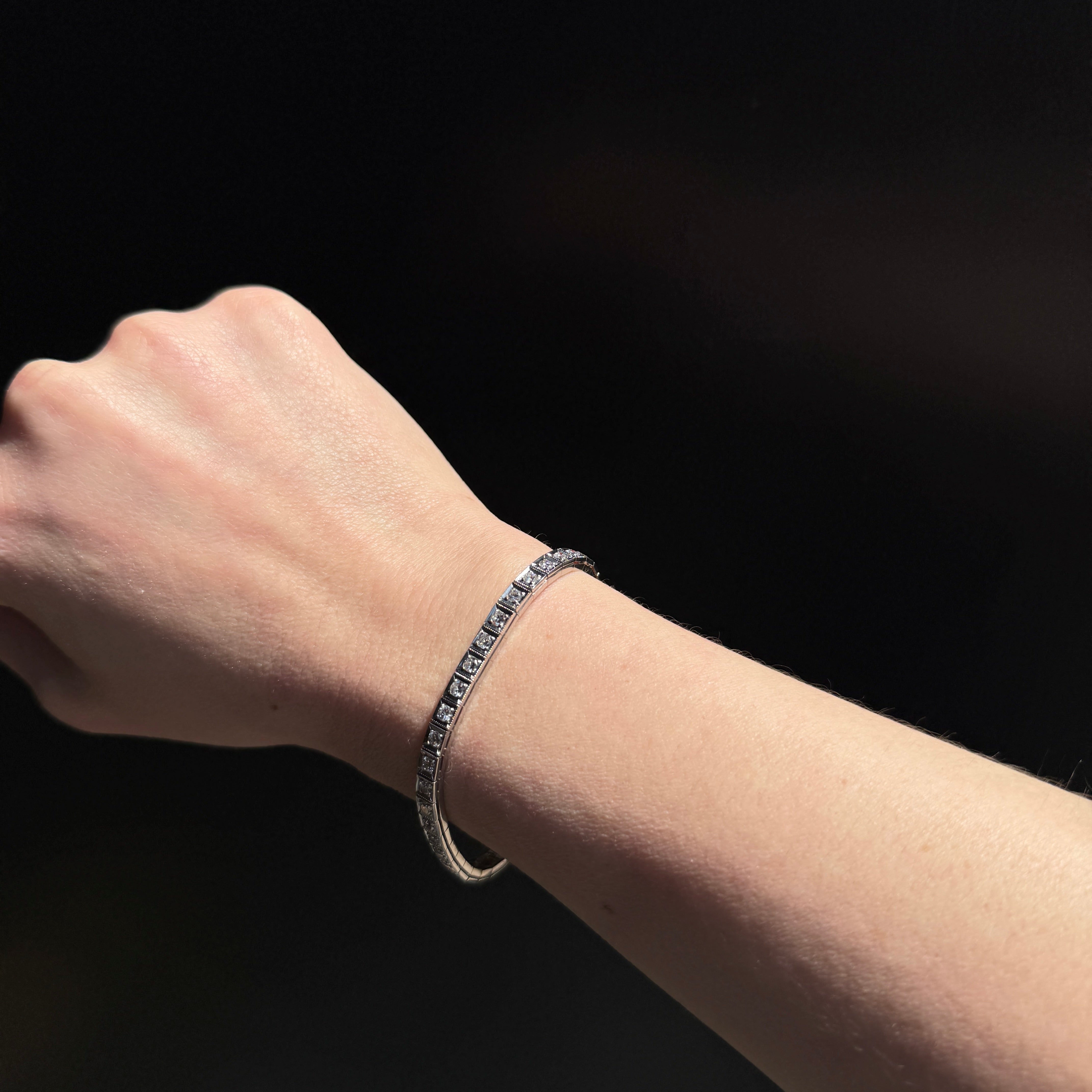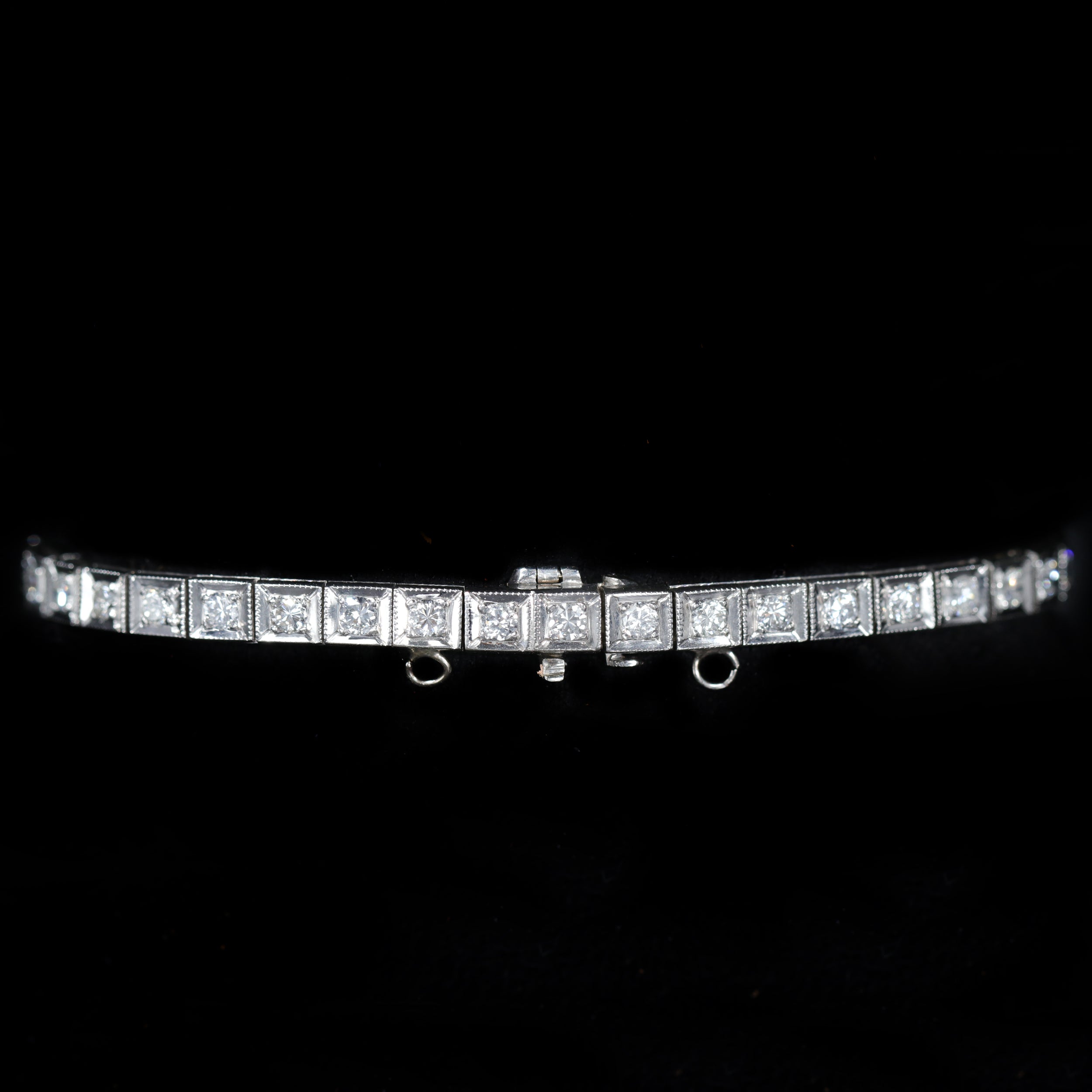 Retro 14K white gold and diamond bracelet. This 1940s straight line bracelet is a classic staple piece, showcasing transitional and early round brilliant cut diamonds. Measuring 7.25 inches in length, the bracelet secures with an invisible tongue clasp, enhanced by a safety latch and chain for added peace of mind.