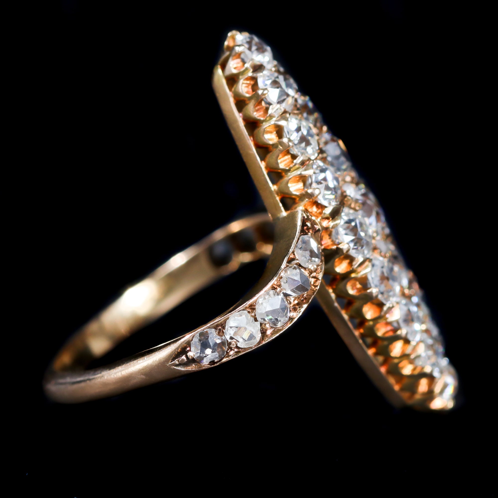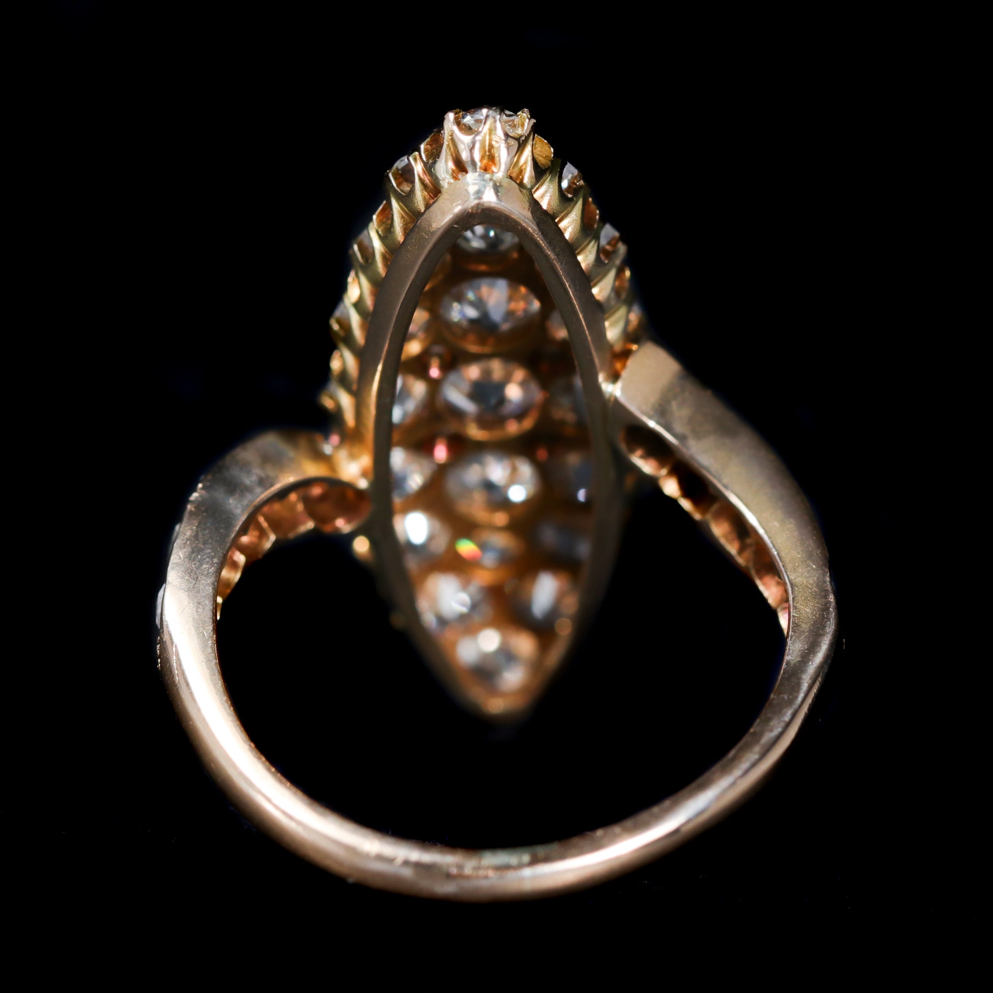 Victorian 18K yellow gold and diamond ring. An elongated navette silhouette gives this Victorian ring its dramatic, finger-lengthening shape, set with 21 Old Mine cut diamonds and 14 rose-cut diamonds totaling approximately 3.00 carats. The Old Mine cuts provide soft, romantic brilliance, while the rose cuts add a gentle shimmer that feels distinctly antique. Bold yet graceful, this is a striking example of Victorian design at its most expressive.