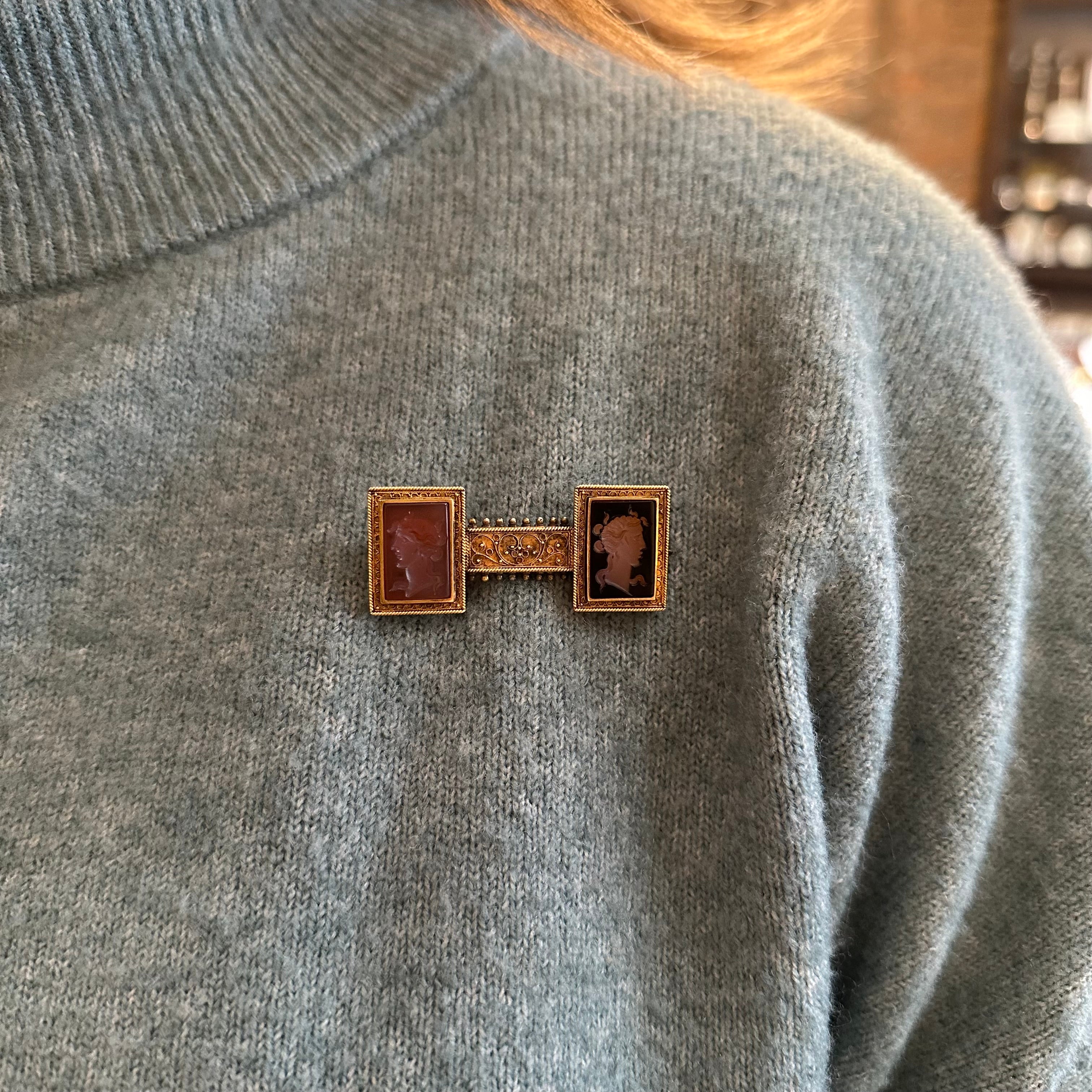 Victorian Etruscan Revival 14k yellow gold agate intaglio brooch. This stunning Victorian brooch features gorgeous ornamental details that are revived from the distinctive artistic style of the Etruscans. Framed depictions of figures in profile are crafted in intaglio on either side of the piece, symbolizing good versus evil, a theme regularly used in all branches of art throughout history. The use of corded wire and granulation adds a beautiful depth to the piece.