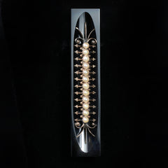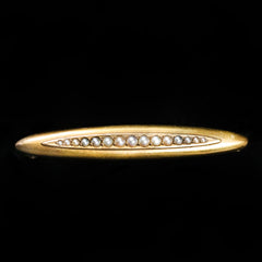 Victorian 14K yellow gold, pearl, and enamel bracelet. This classic Victorian bracelet showcases intricate weaving of yellow gold, featuring a slide element embellished with a dancing tassel, tiny seed pearl, and black enamel accents (taille d'epargne) that adjusts the mesh strap, while the end is capped with a complementing seed pearl and enamel tassel.